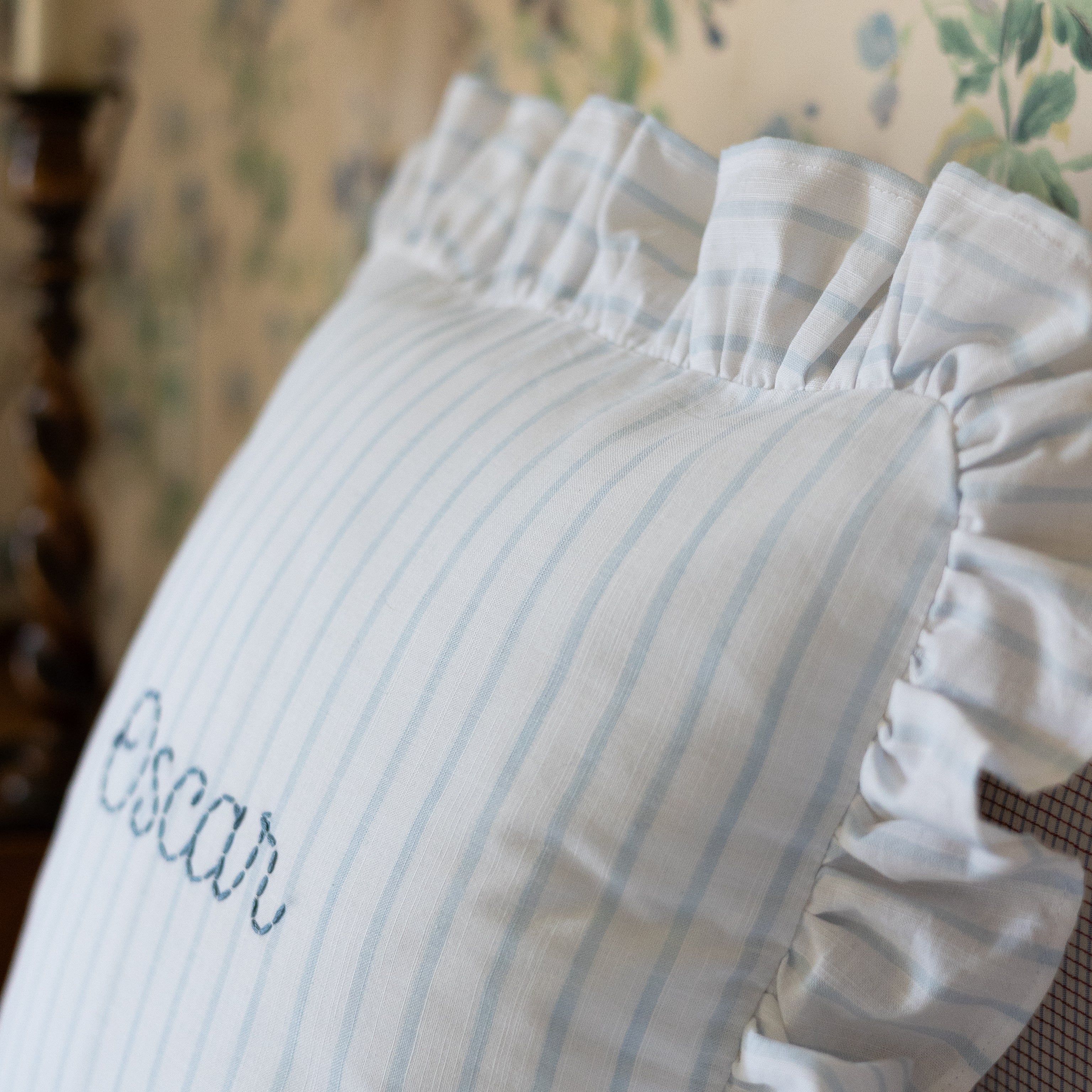 The embroidery is handmade in our own atelier in Portugal by our experienced and specialised embroiderers. You can personalise your item with a name, word, or initials in your choice of color. For reference, the embroidery color shown in the pictures is 'Blue Jeans'.