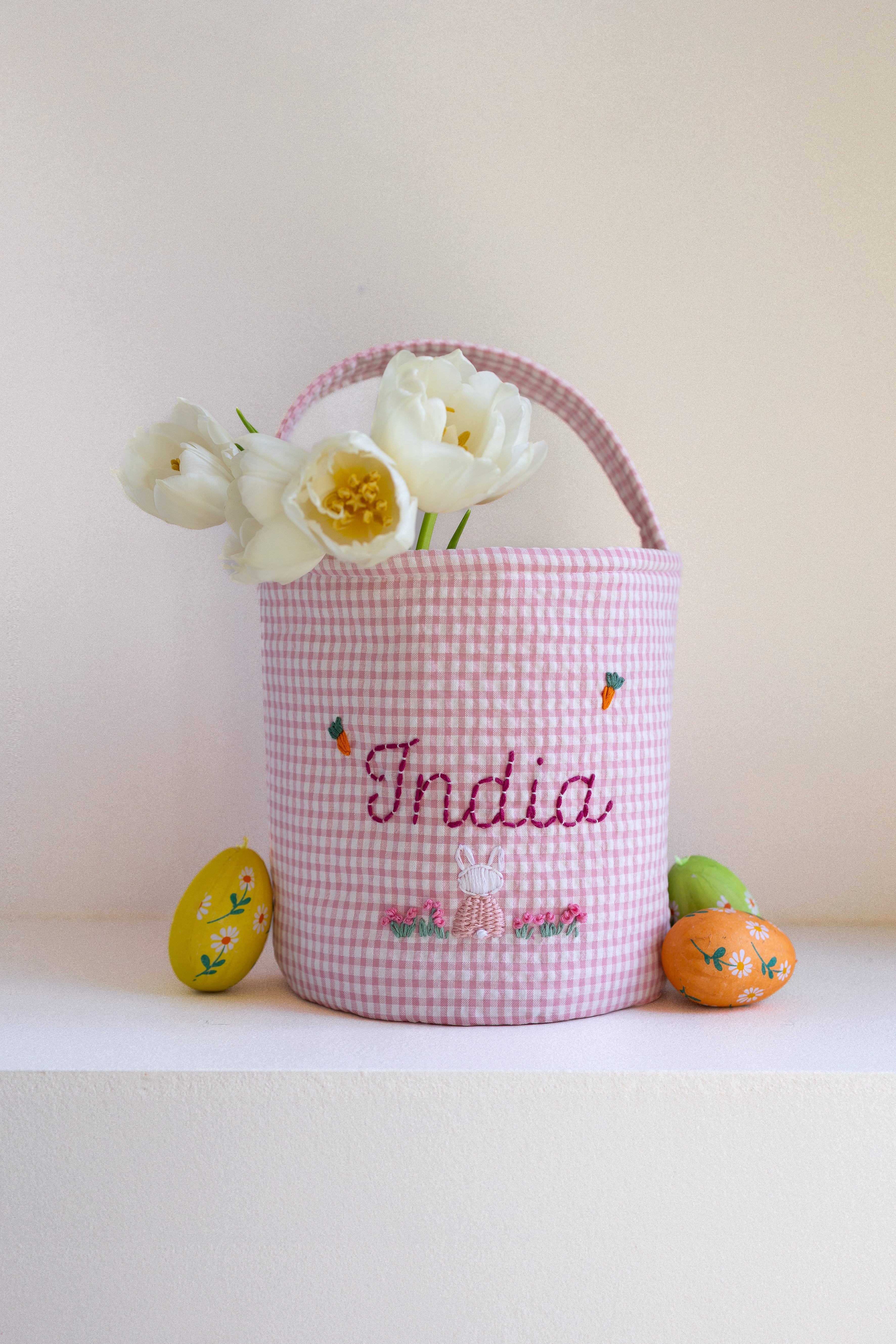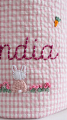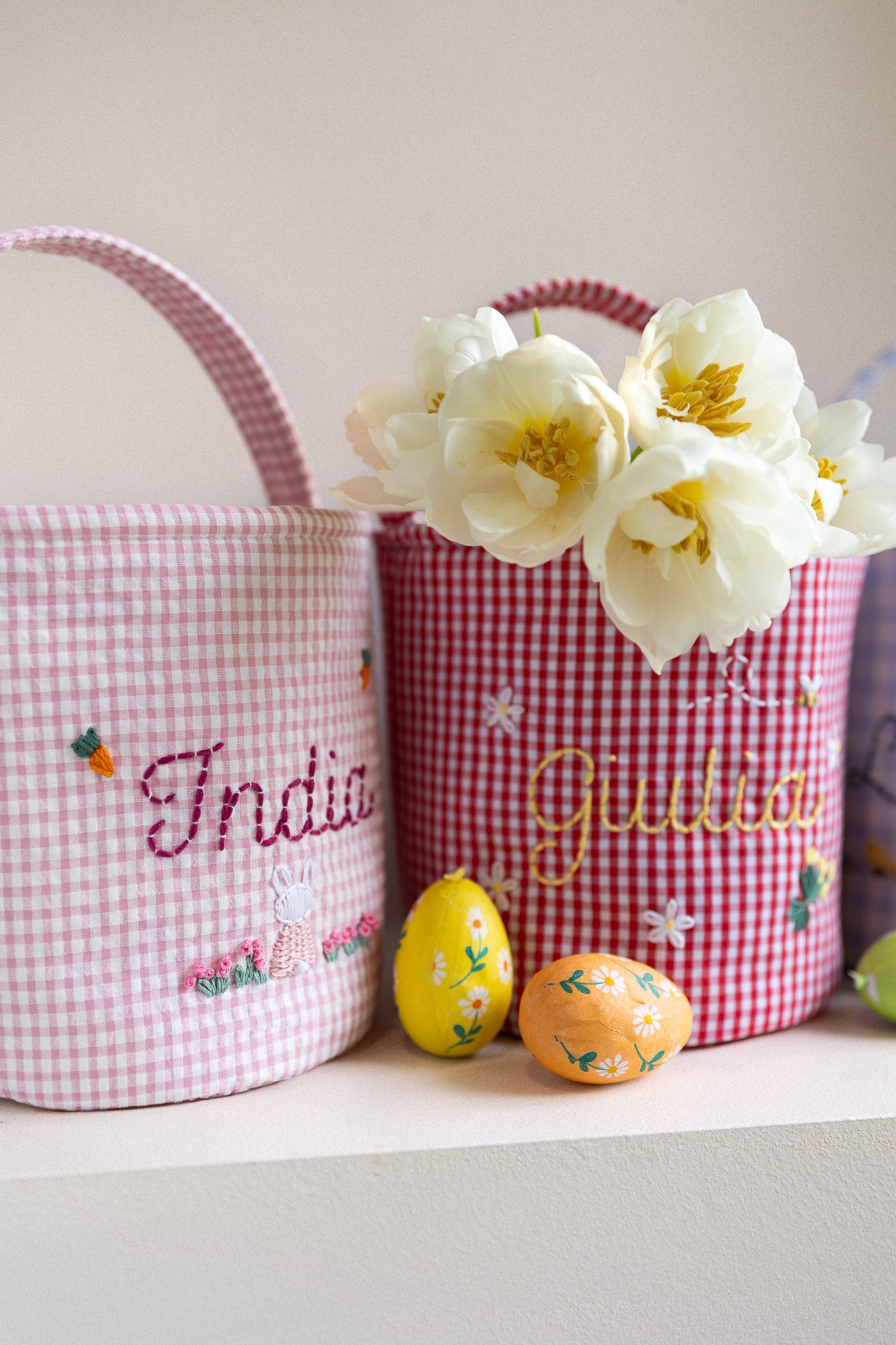 The Easter bag is hand-embroidered in our own atelier. The fabric is pink gingham cotton and is OEKO-TEX® certified. You can personalise your Easter bag with a name, word or initials in your favourite colour.