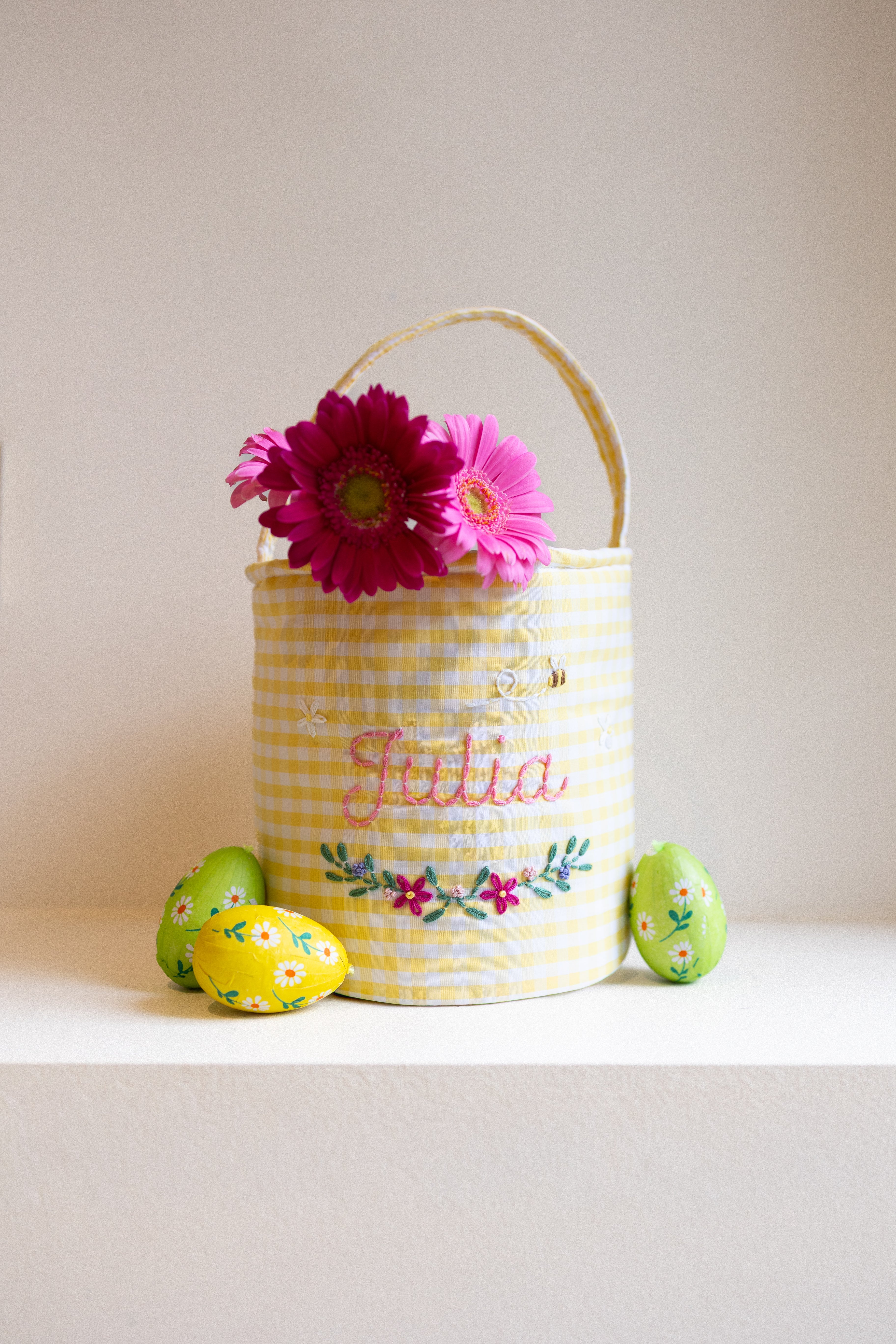 The Easter bag is hand-embroidered in our own atelier. The fabric is yellow gingham cotton and is OEKO-TEX® certified. You can personalise your Easter bag with a name, word or initials in your favourite colour.