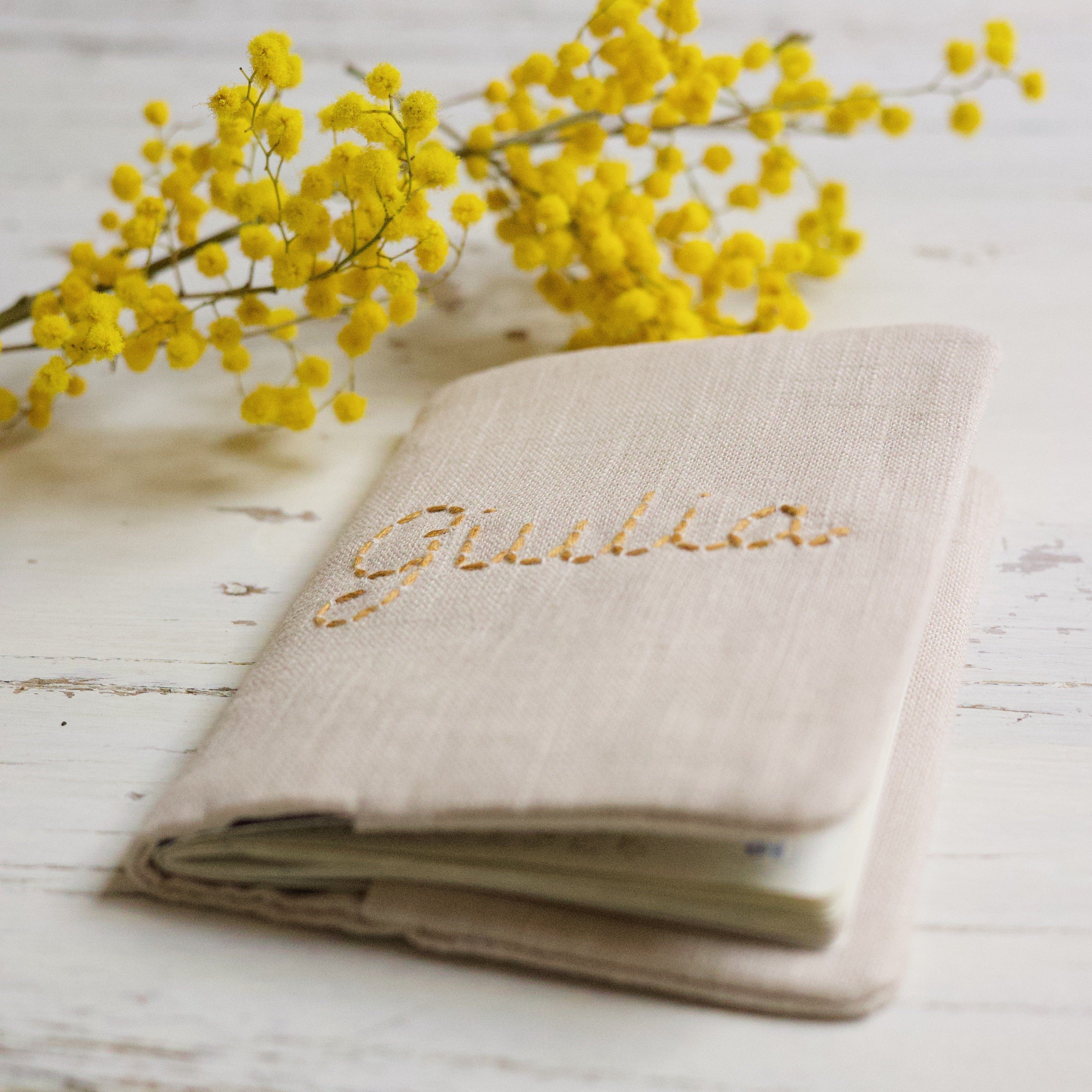 The health book covers allow you to cover the French health book and/or store important papers. They are hand-embroidered and handcrafted in our own atelier using organic cotton fabrics that are Oeko-Tex certified. You can personalise your health book with a name, word, or initials in your favorite colour!