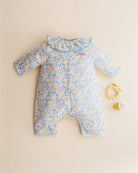 Very soft and comfortable pyjamas for babies, featuring a delicate flower print and a pleated collar. Designed with front buttons and convenient snap fastenings along the legs for easy changing.