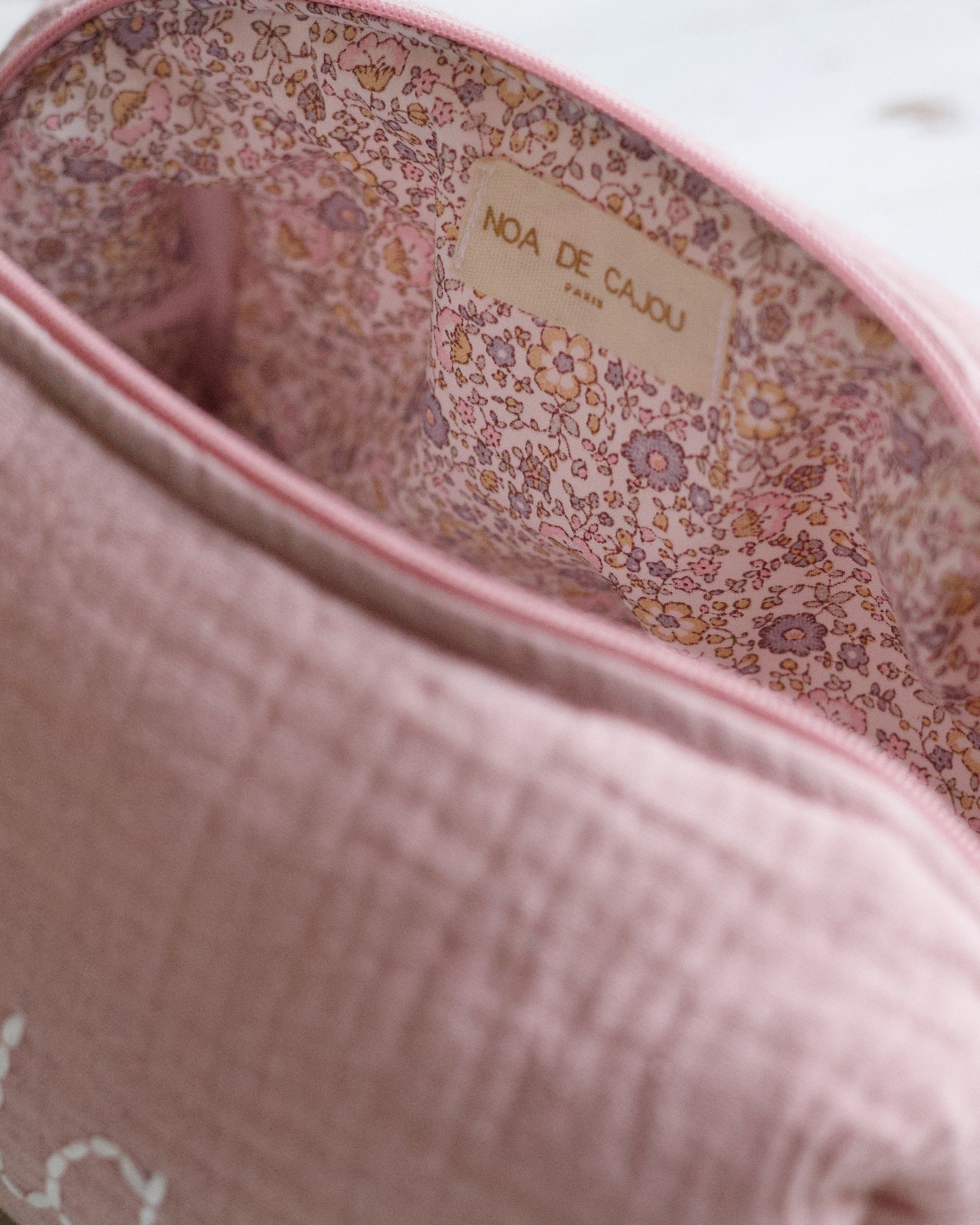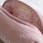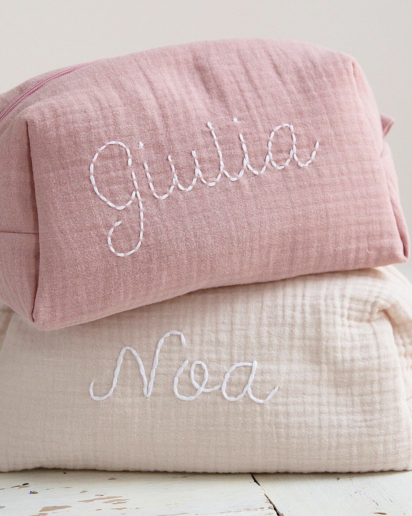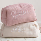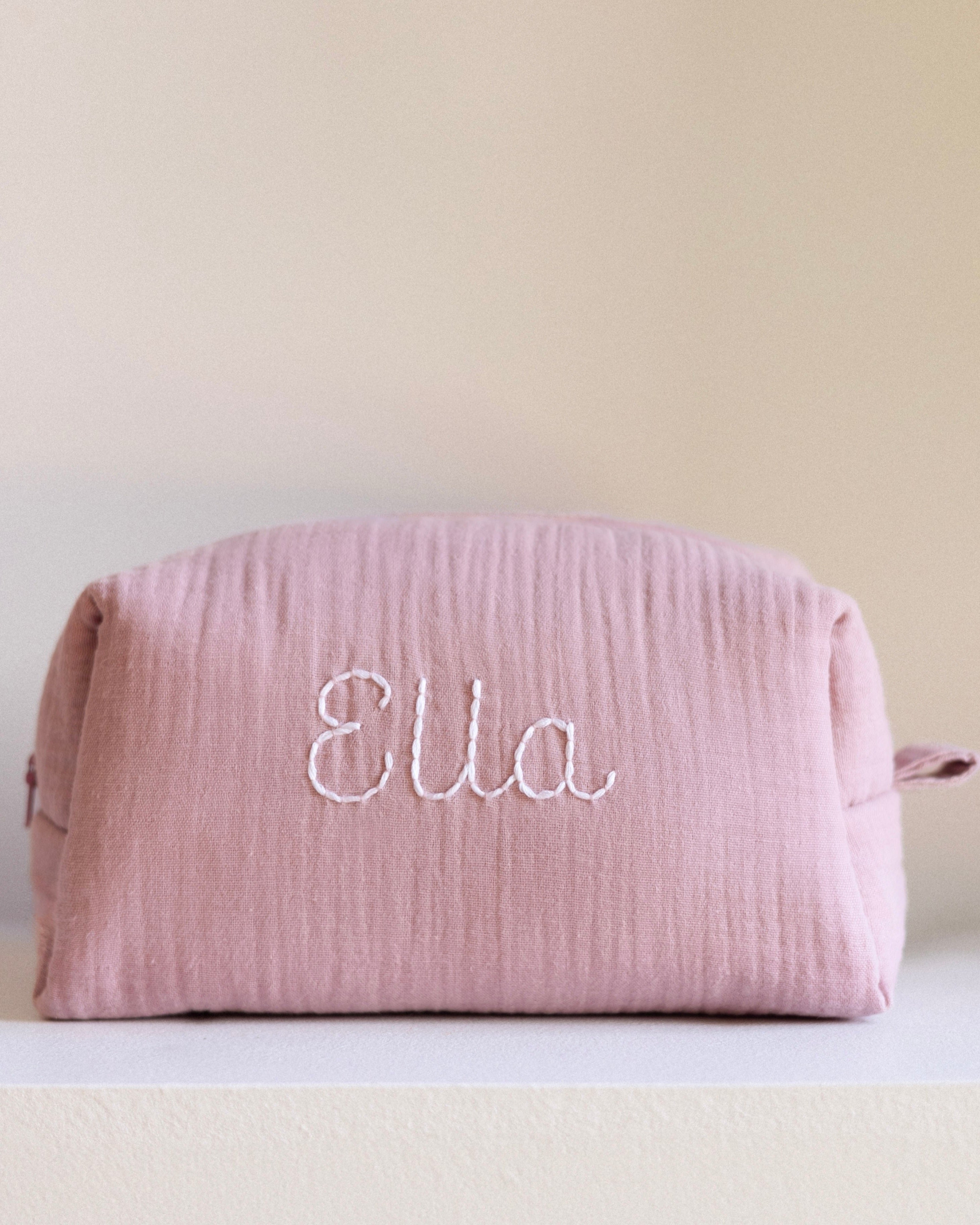 The toiletry bag is hand-embroidered in our own atelier. The fabric is an organic double gauze cotton and Oeko-Tex certified. You can personalise your toiletry bag with a name, word, or initials in your favourite colour!