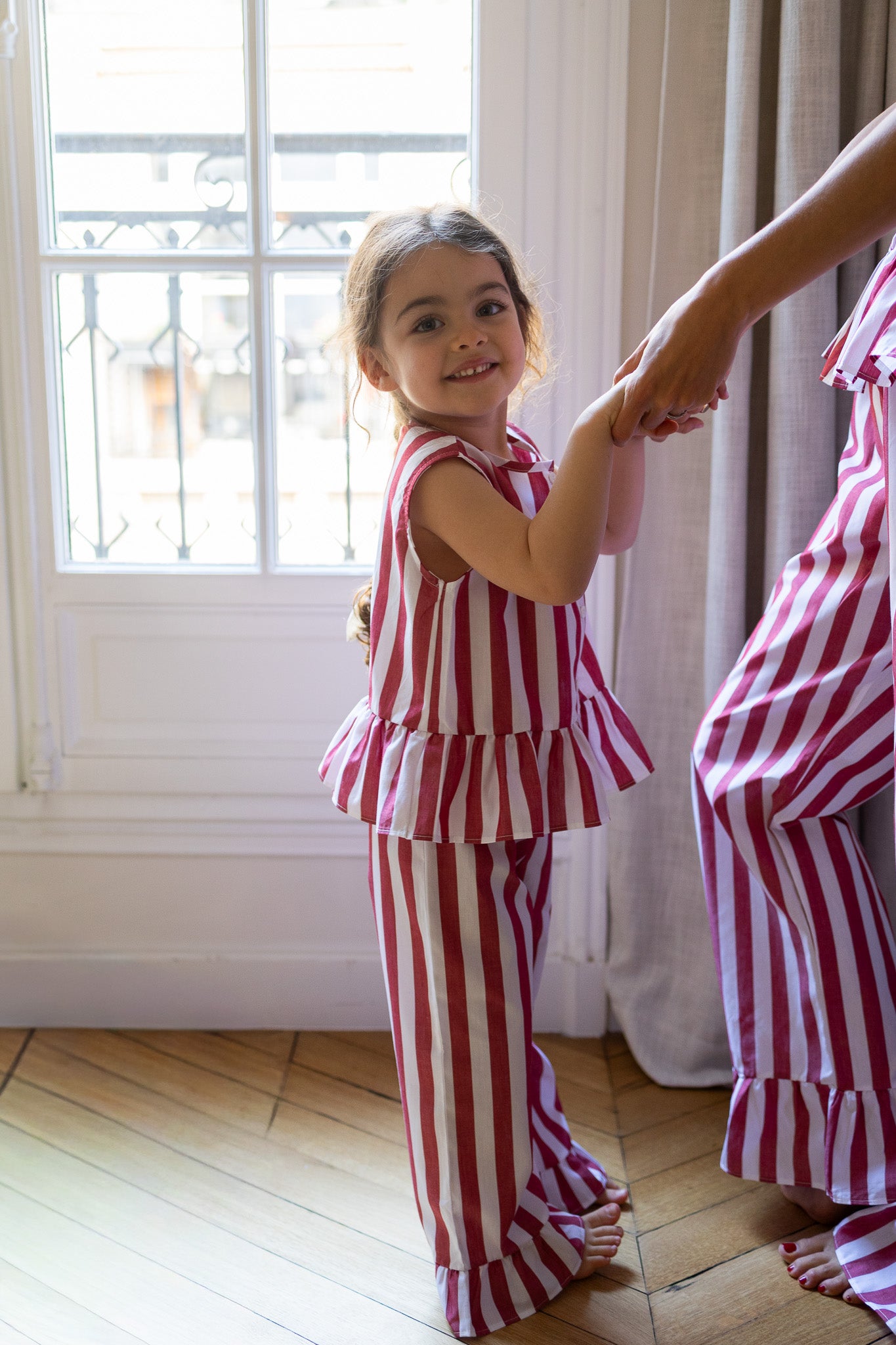 Very comfortable and soft IN & OUT pyjama set. It features large red stripes. The top is buttoned up in the front.