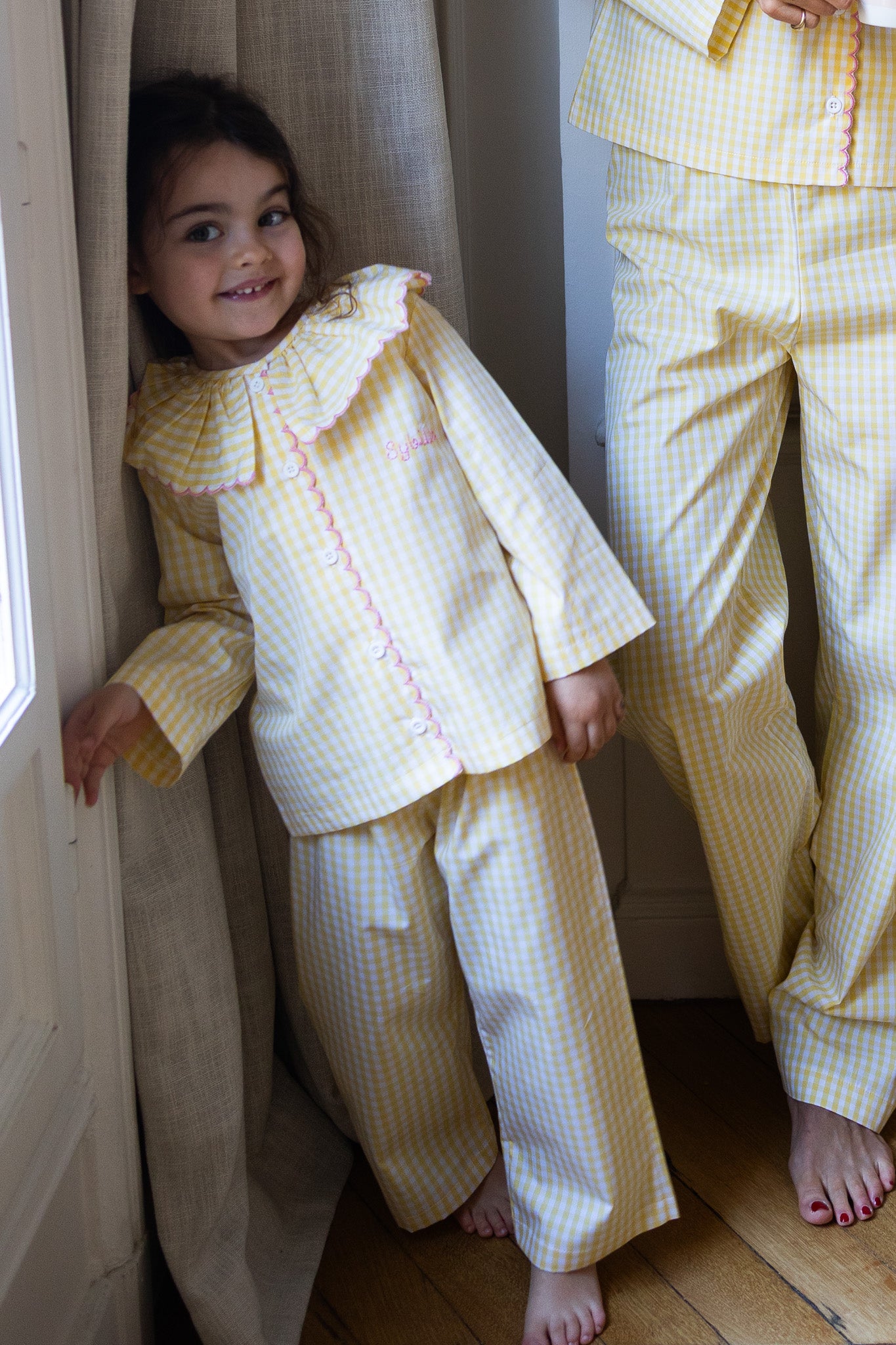 Very comfortable and soft pyjama set. It features a yellow gingham print. The top is buttoned up in the front.