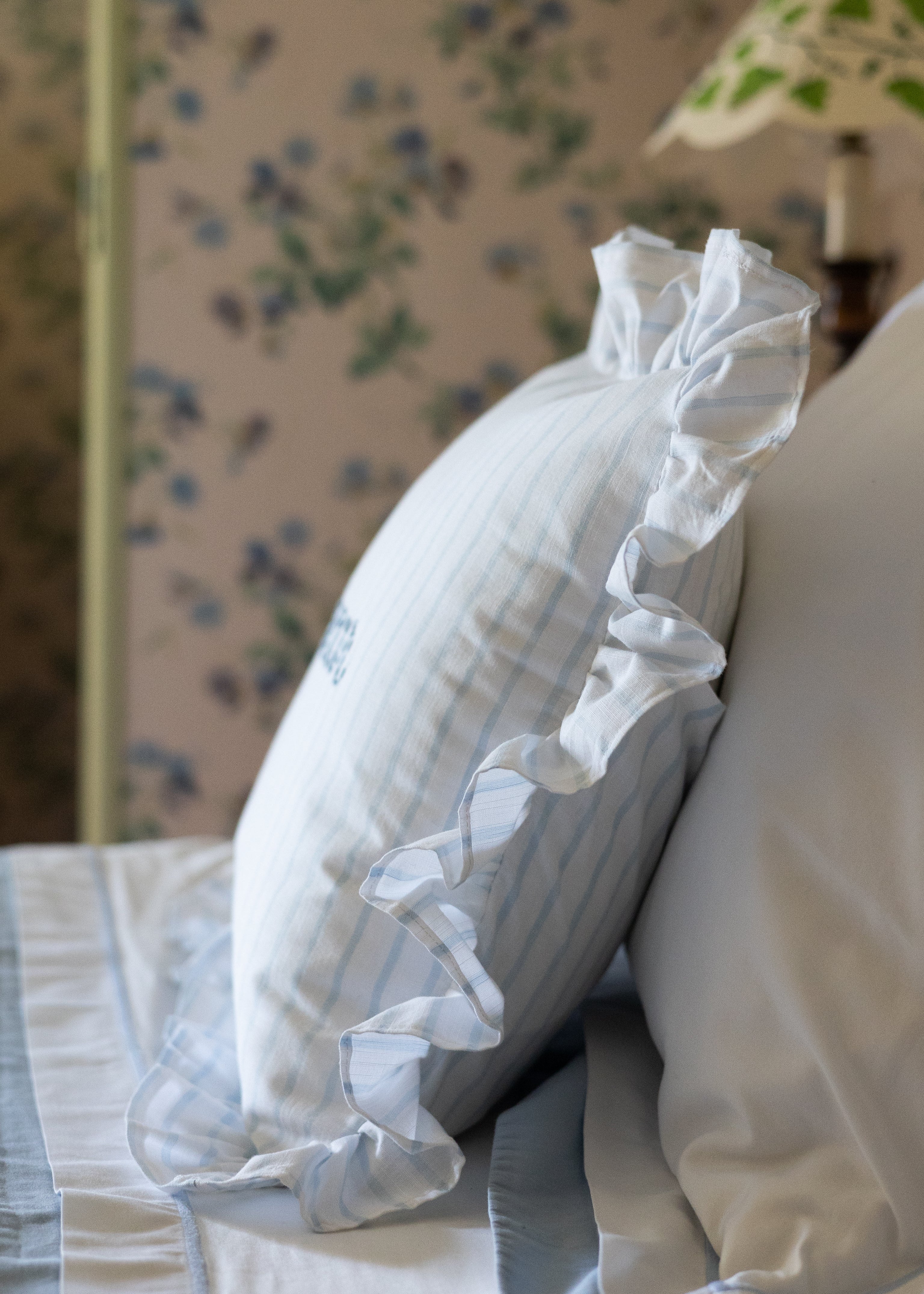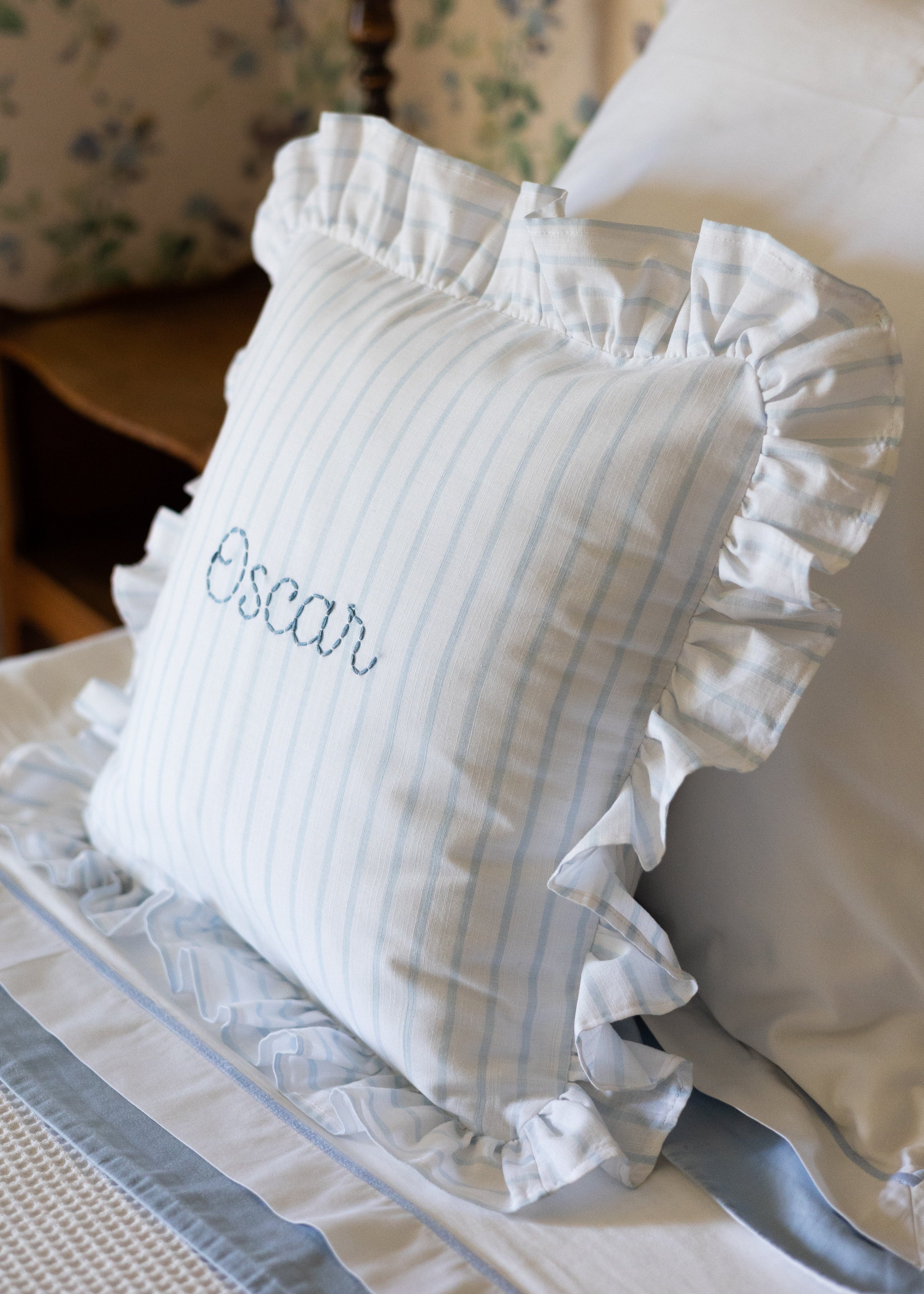 The embroidery is handmade in our own atelier in Portugal by our experienced and specialised embroiderers. You can personalise your item with a name, word, or initials in your choice of color. For reference, the embroidery color shown in the pictures is "Blue Jeans".