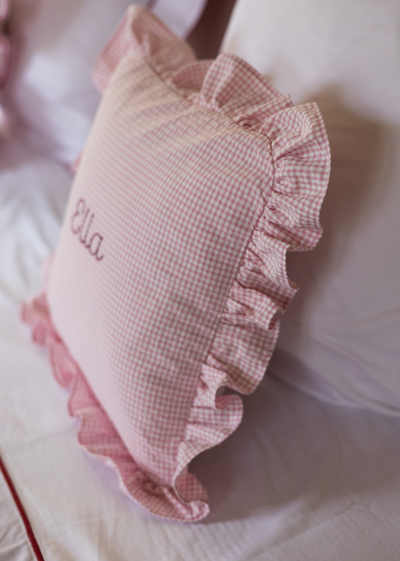 The embroidery is handmade in our own atelier in Portugal by our experienced and specialised embroiderers. You can personalise your item with a name, word, or initials in your choice of color. For reference, the embroidery colors shown in the pictures are "Pink" for Bianca and "Burgundy" for Ella.