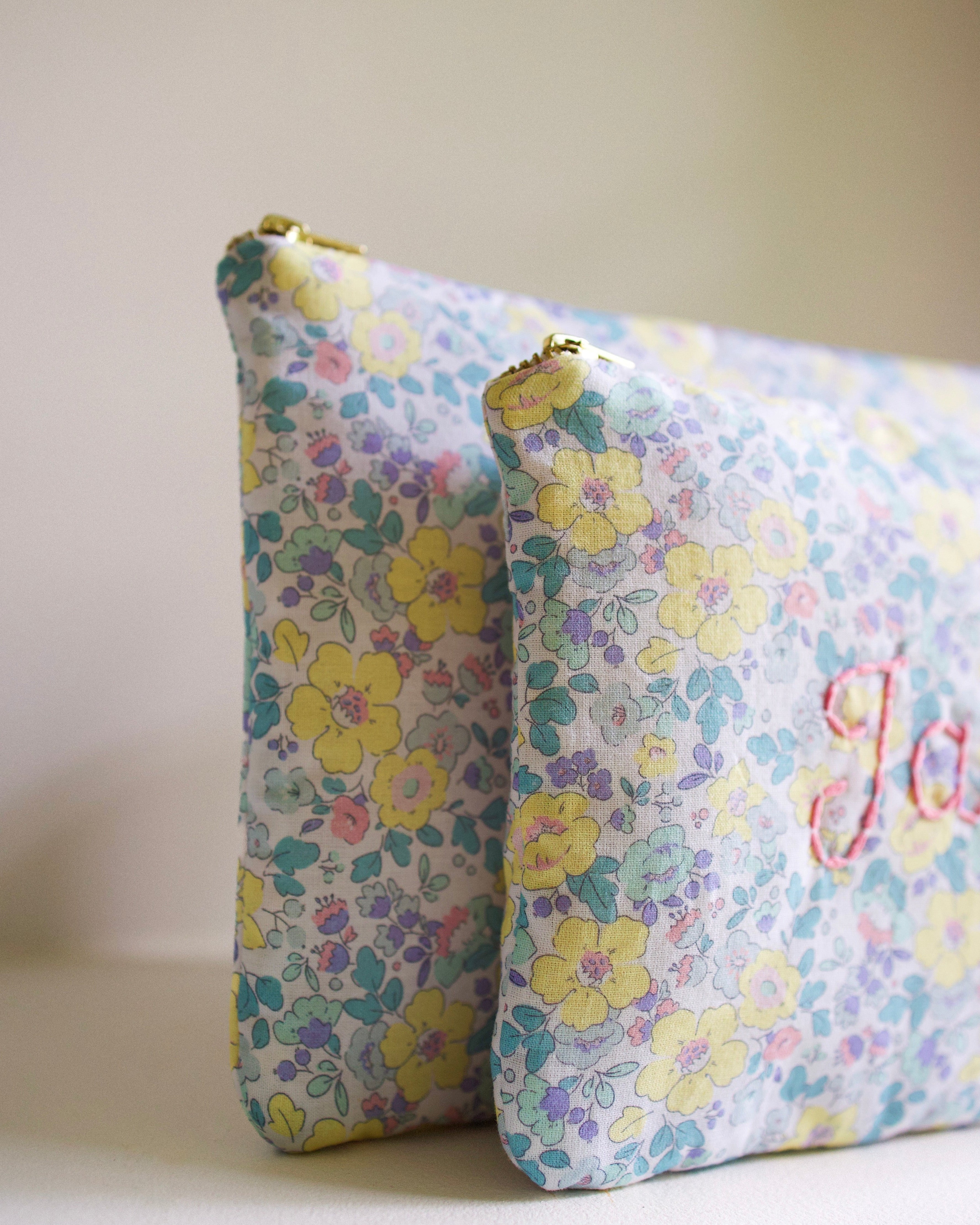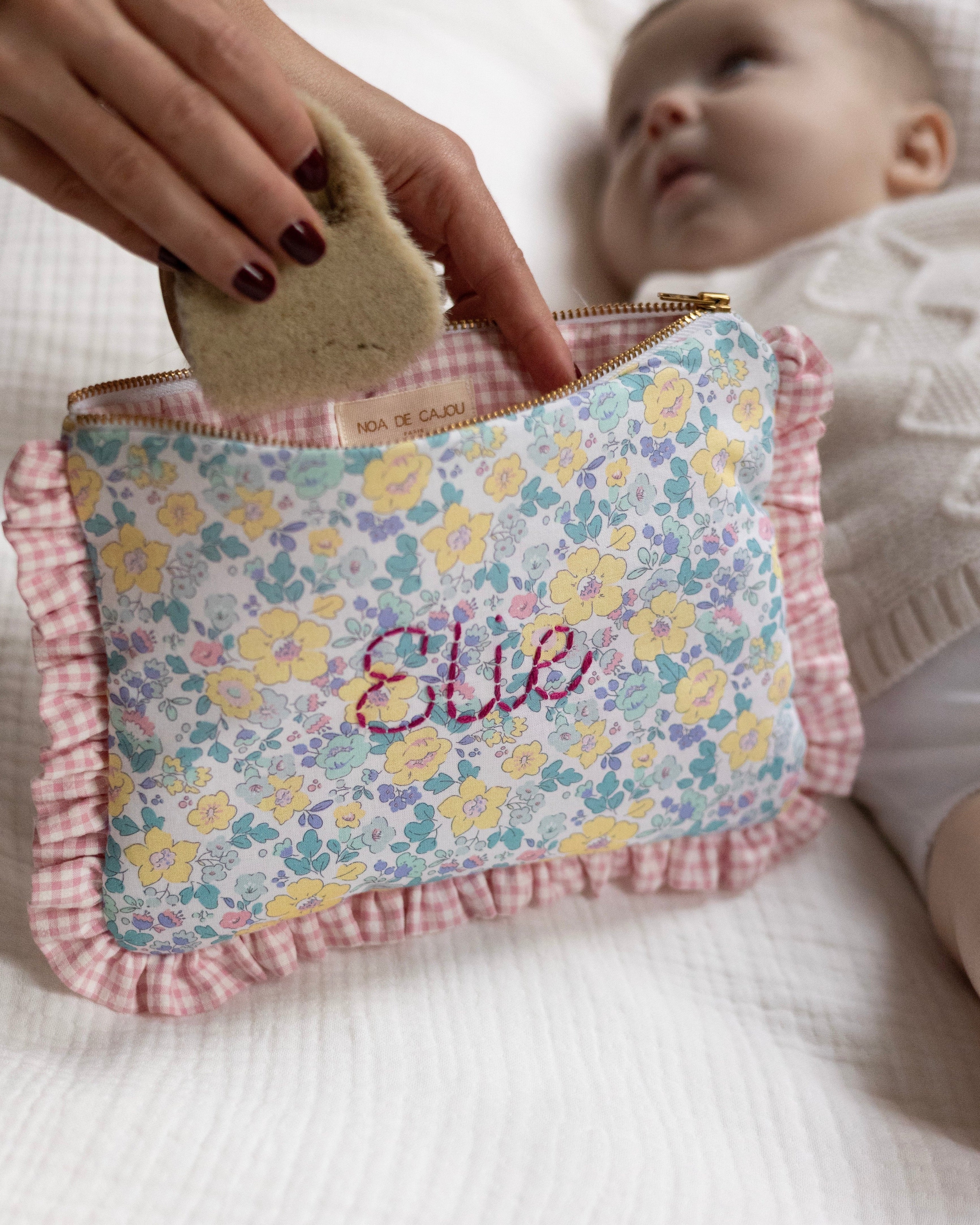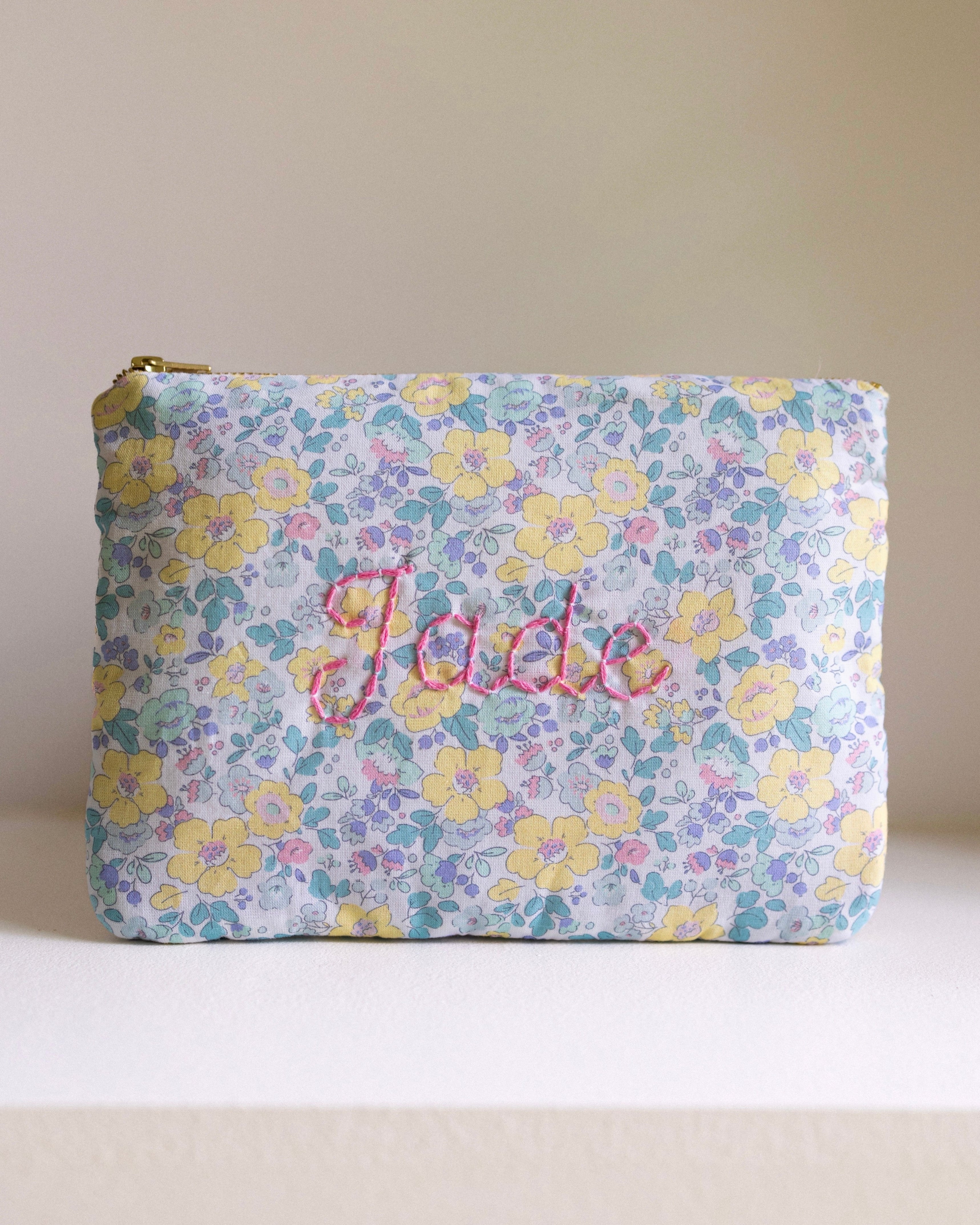 This zipped pouch is hand embroidered in our atelier. The fabrics used are organic and Oeko-Tex certified. You can personalise your pouch with a name or with initials in your favorite color!