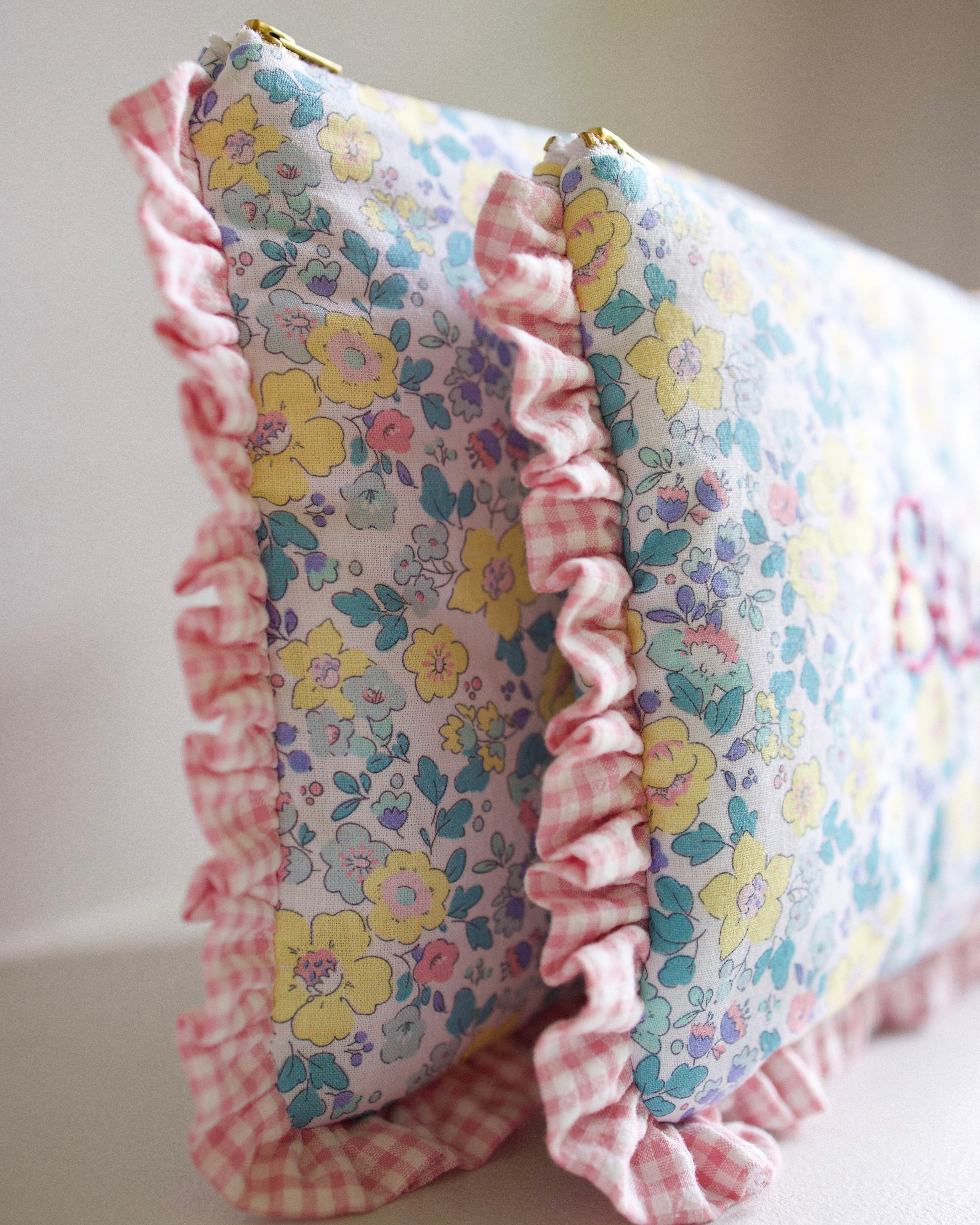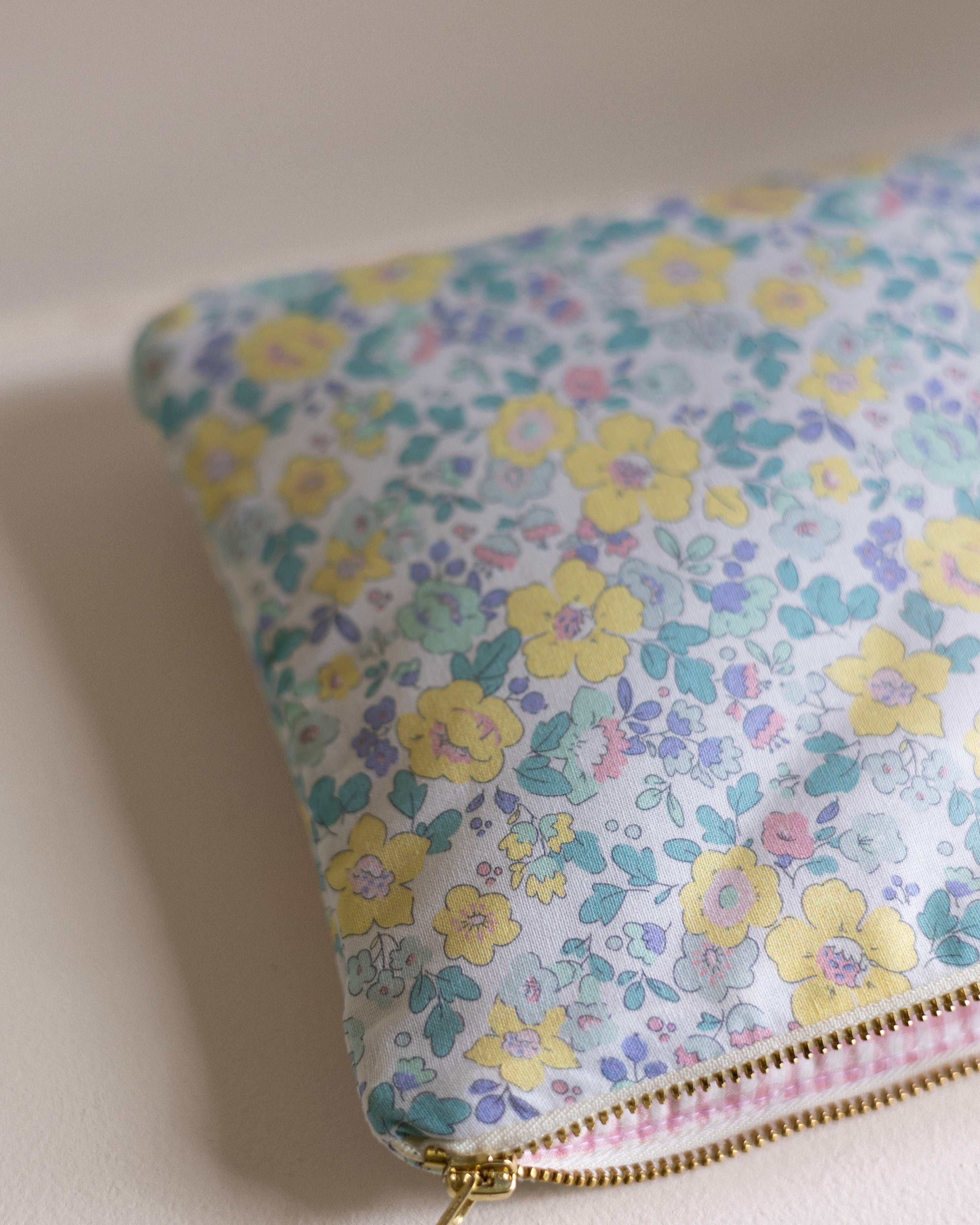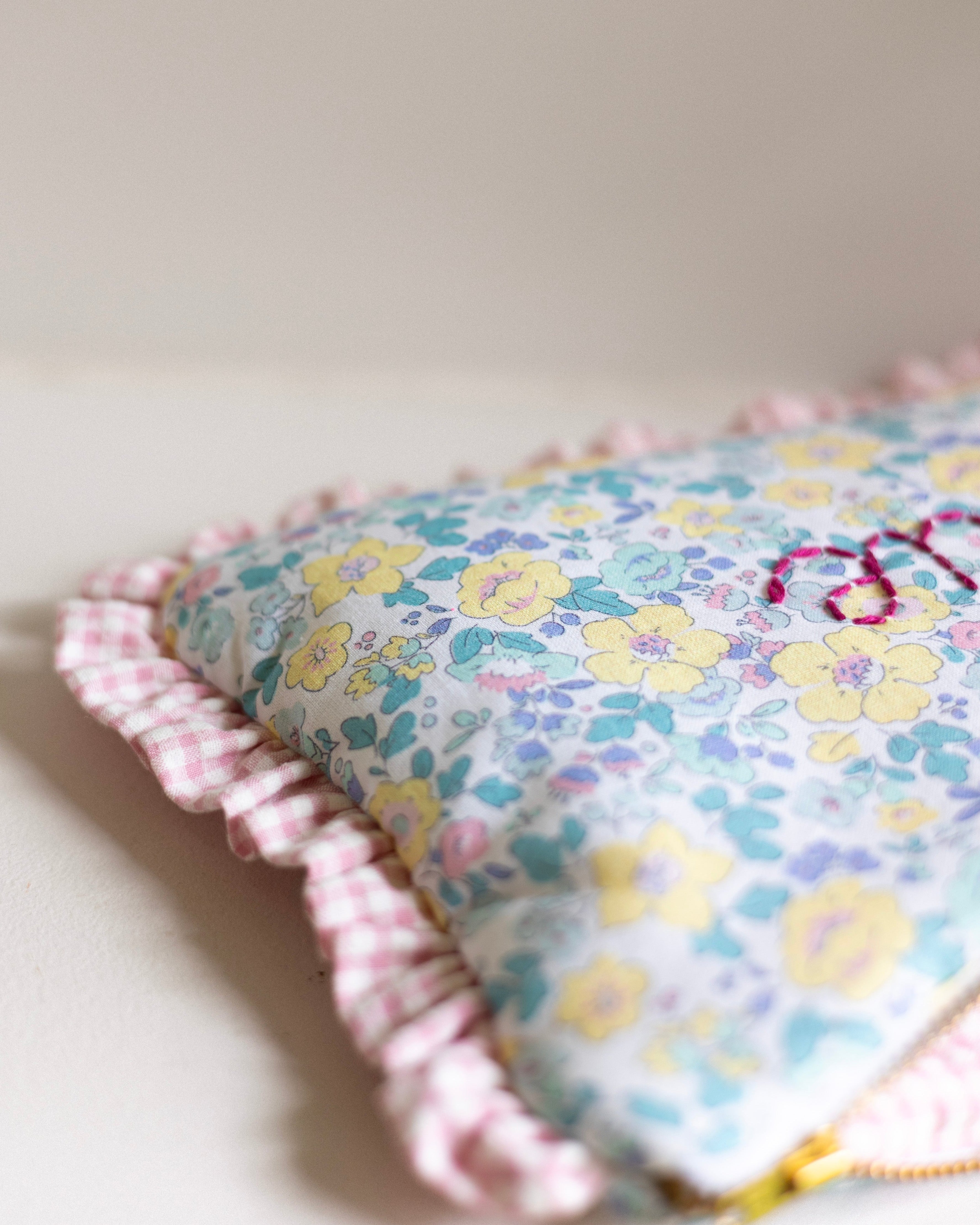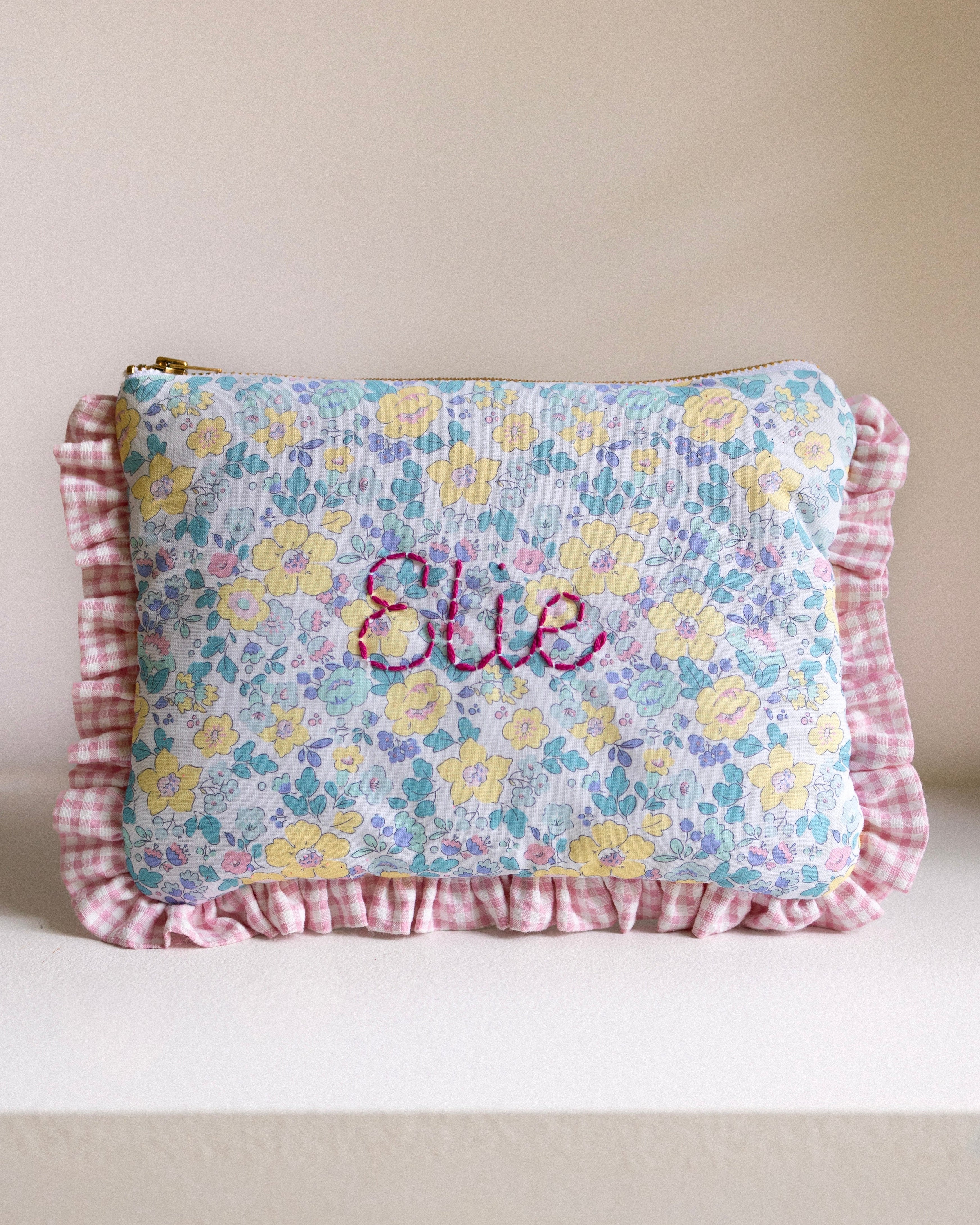 This zipped pouch is hand embroidered in our atelier. The fabrics used are organic and Oeko-Tex certified. You can personalise your pouch with a name or with initials in your favorite color!