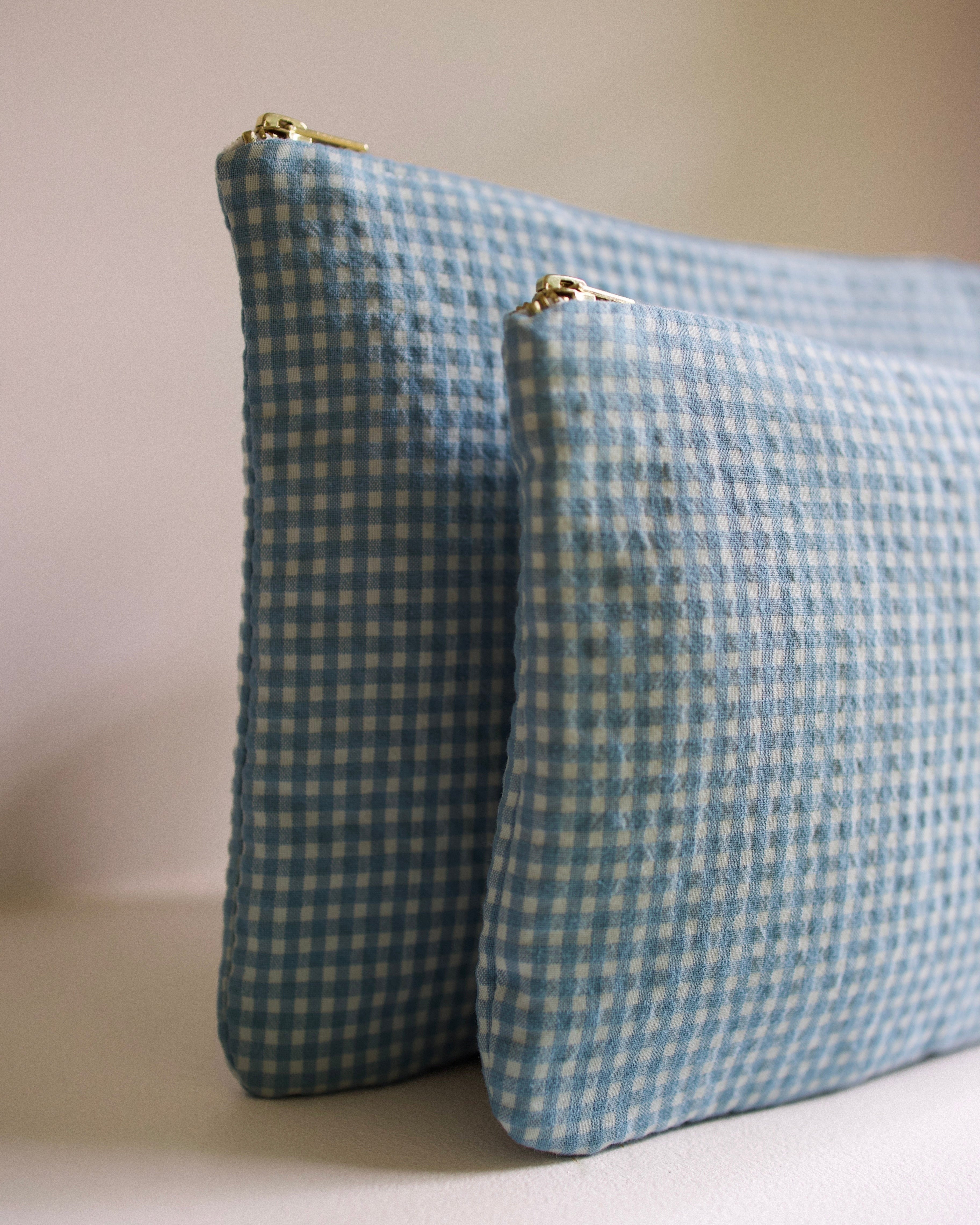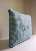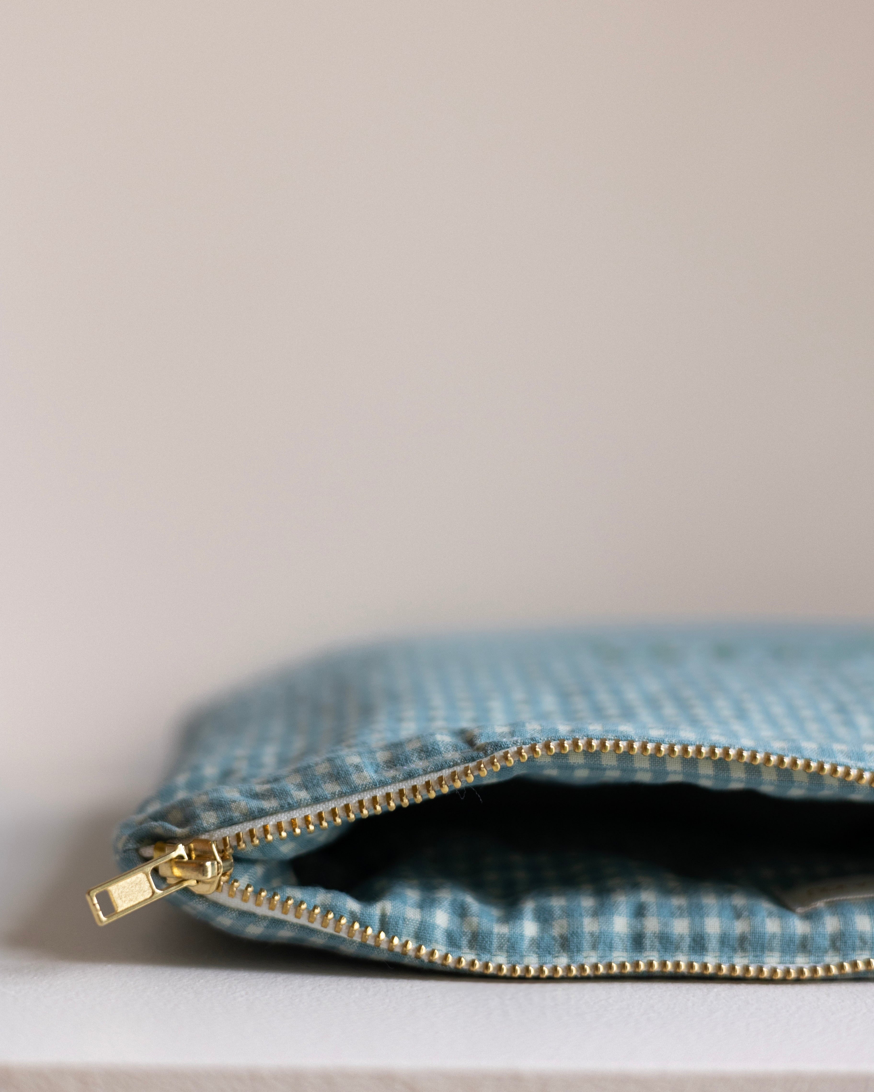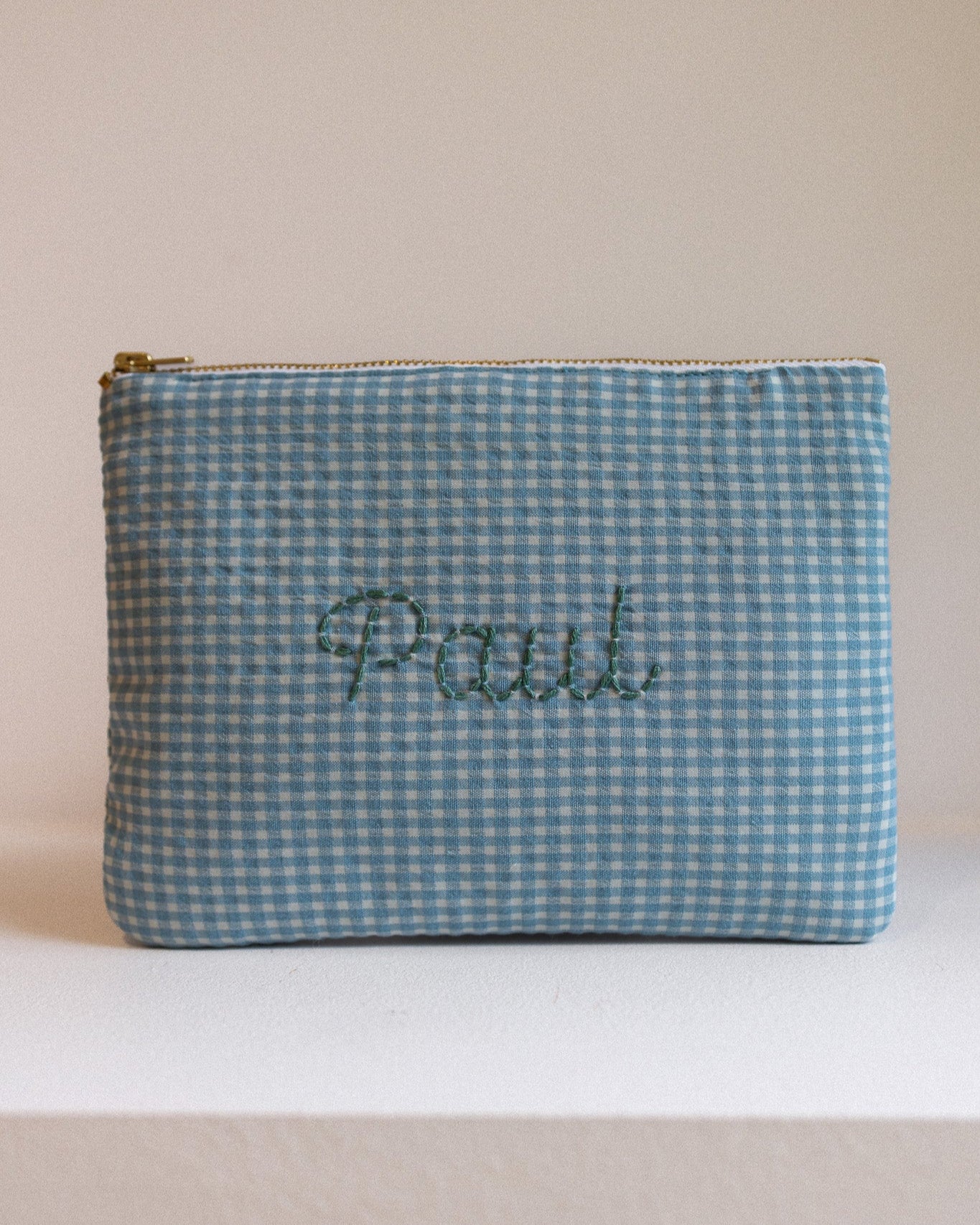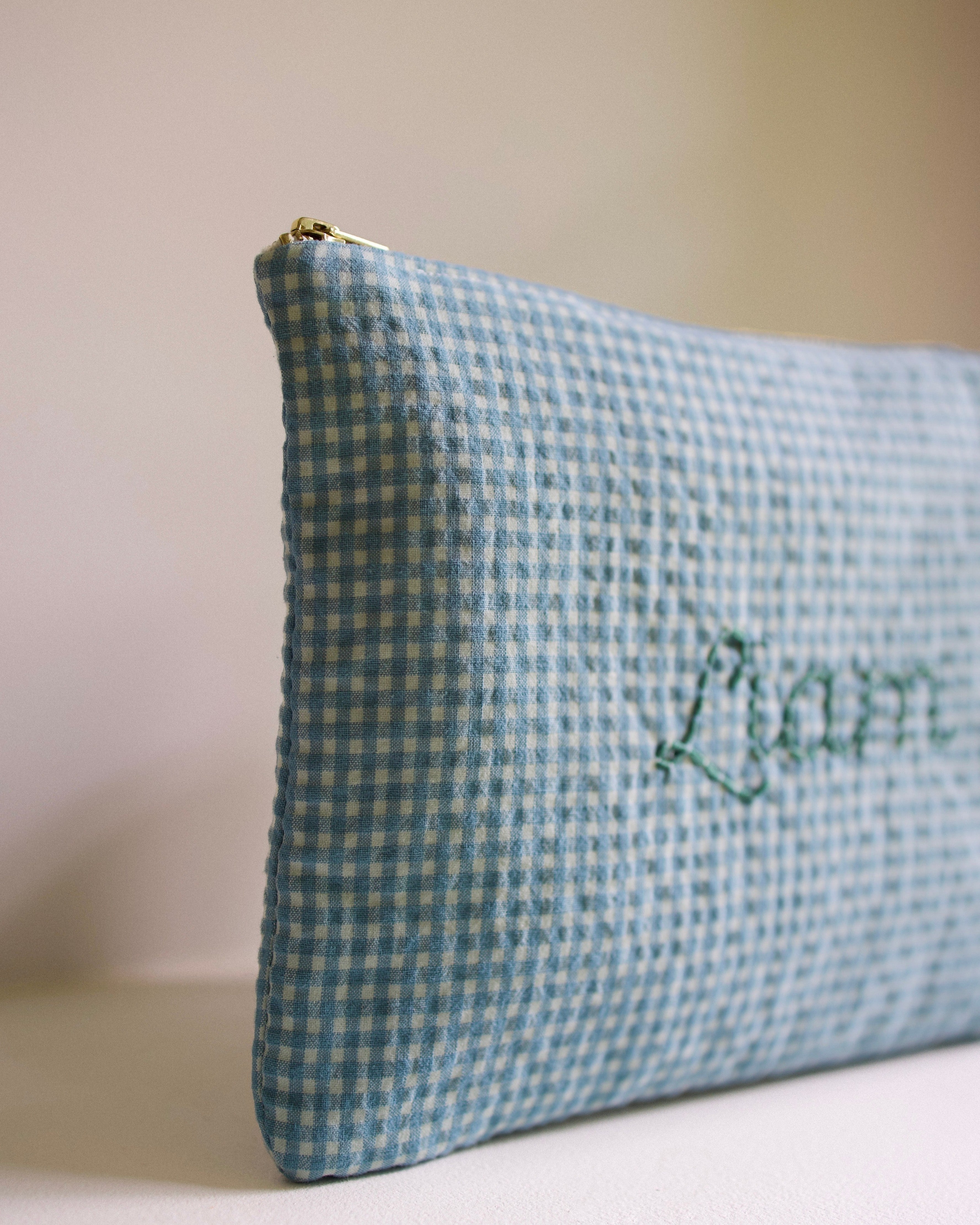 This zipped pouch is hand embroidered in our atelier. The fabrics used are organic and Oeko-Tex certified. You can personalise your pouch with a name or with initials in your favorite color!