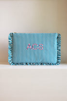This laptop cover is hand-embroidered in our own atelier. It's made from 100% cotton, Oeko-Tex certified fabric. The design features teal stripes. You can personalise it with a name or initials in your favourite colour!