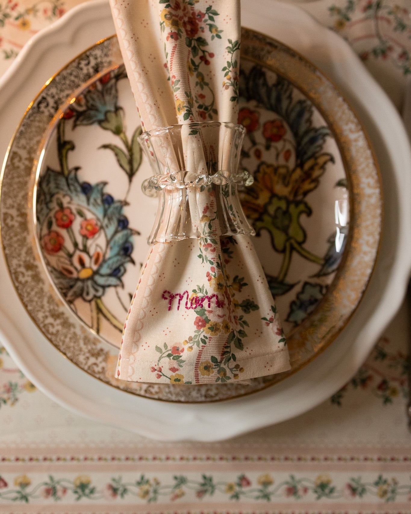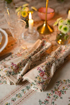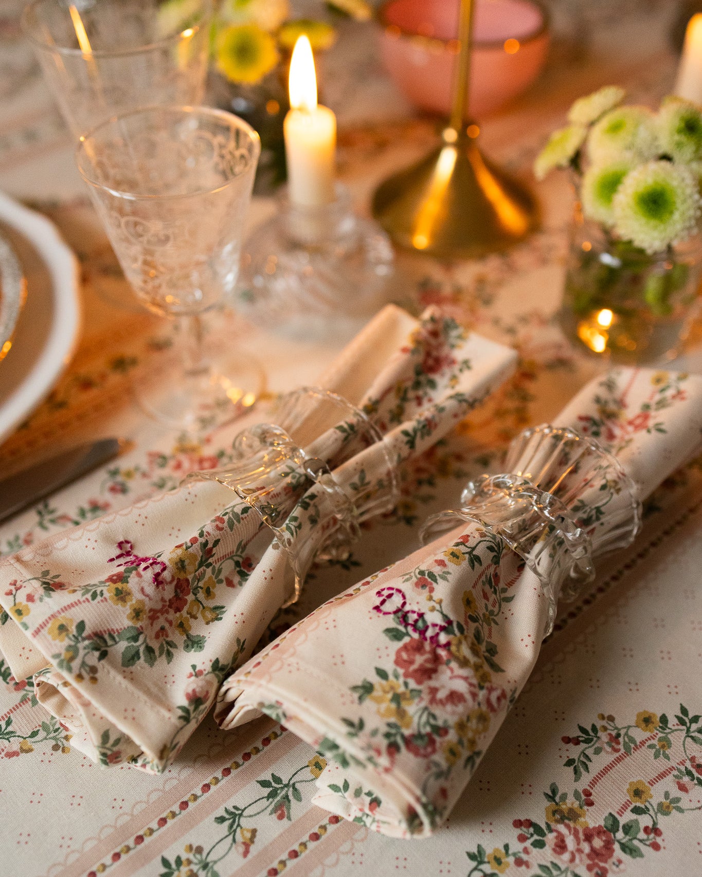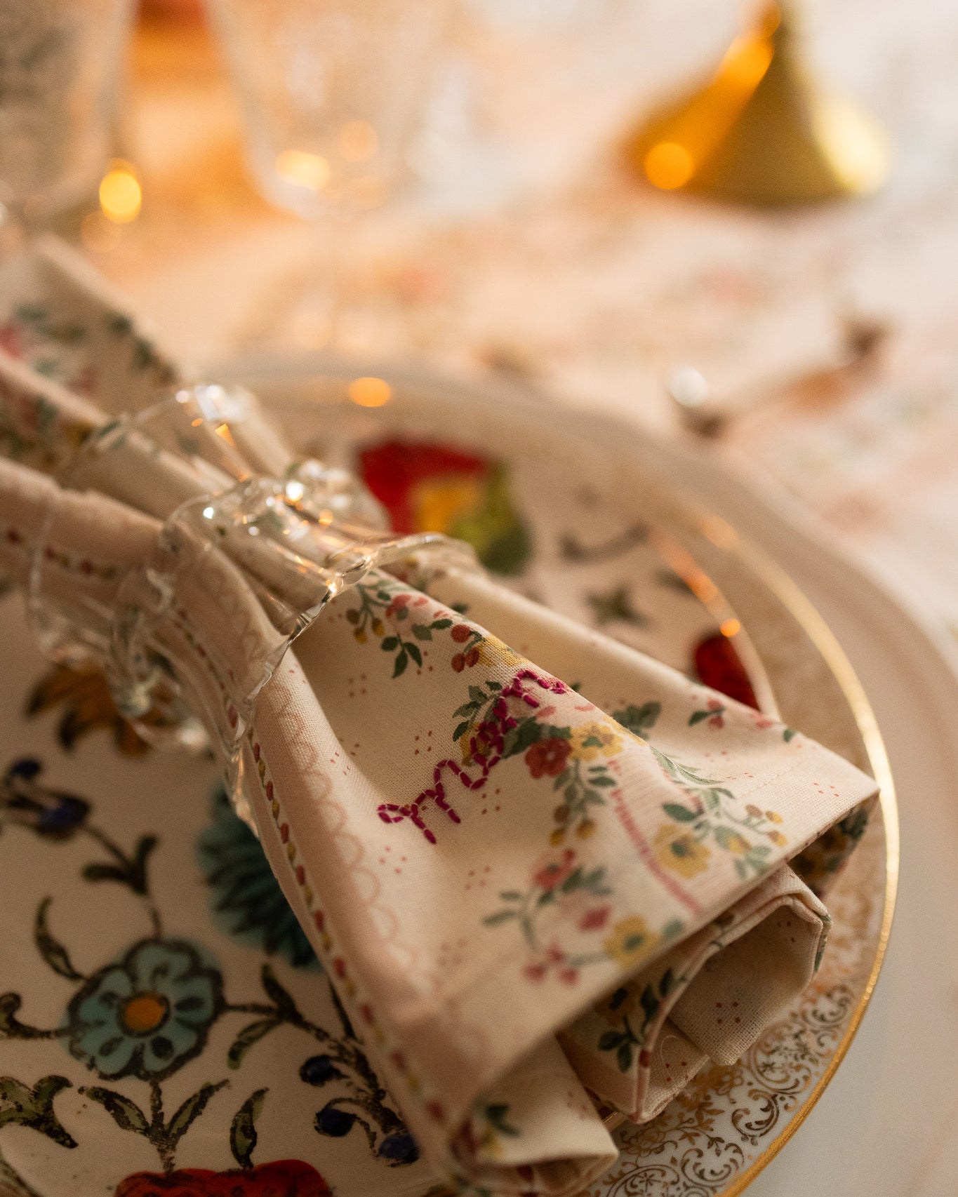 This napkin is the perfect finishing touch to elevate your table setting and matches with it's tablecloth. Crafted from 100% Oeko-Tex certified cotton, it features a romantic floral pattern in soft pastel tones - beautifully inspired by an antique quilt discovered in the Ribatejo region of Portugal.