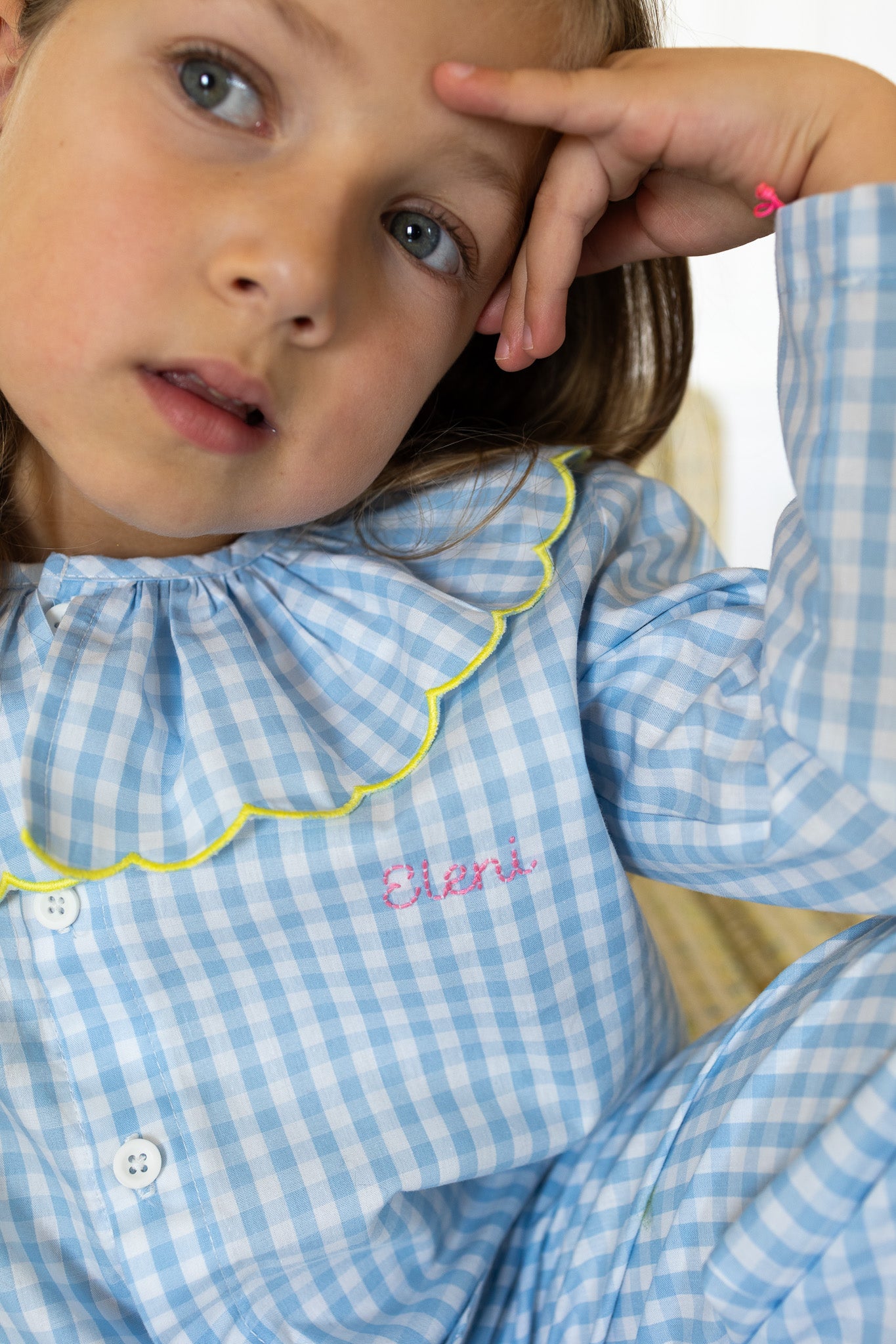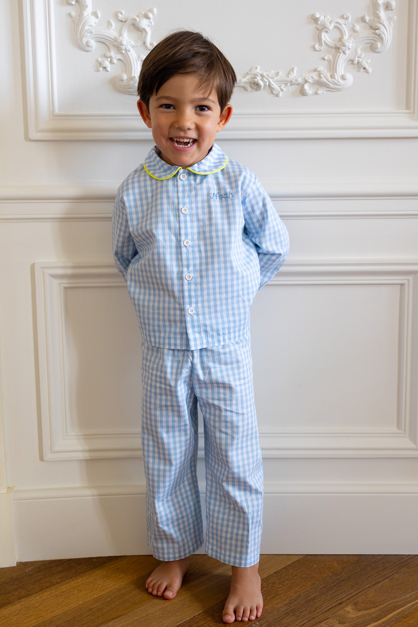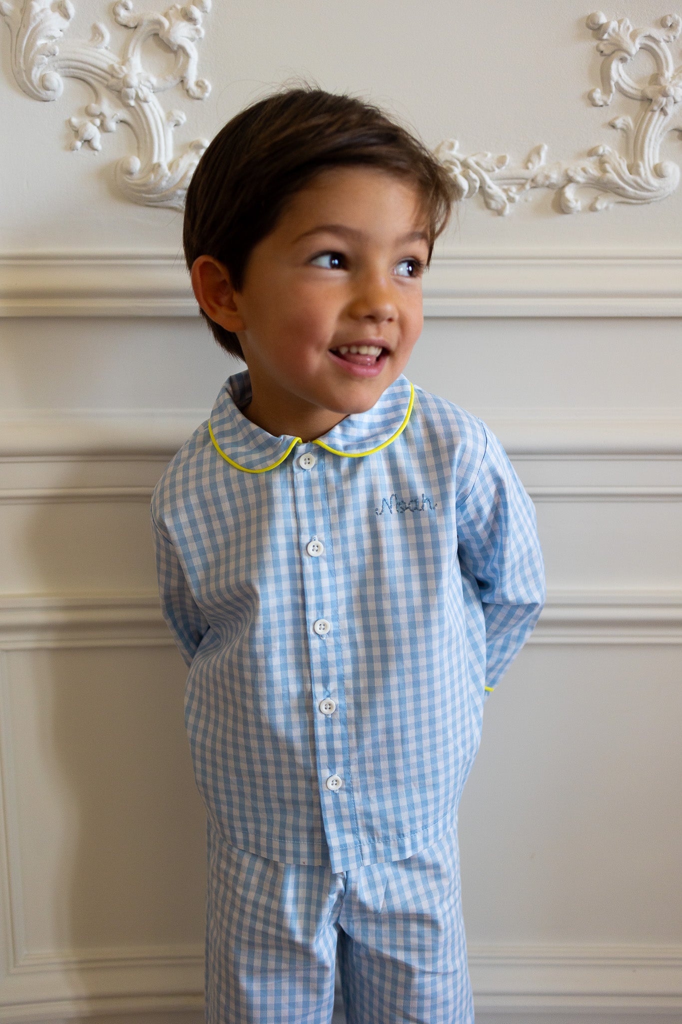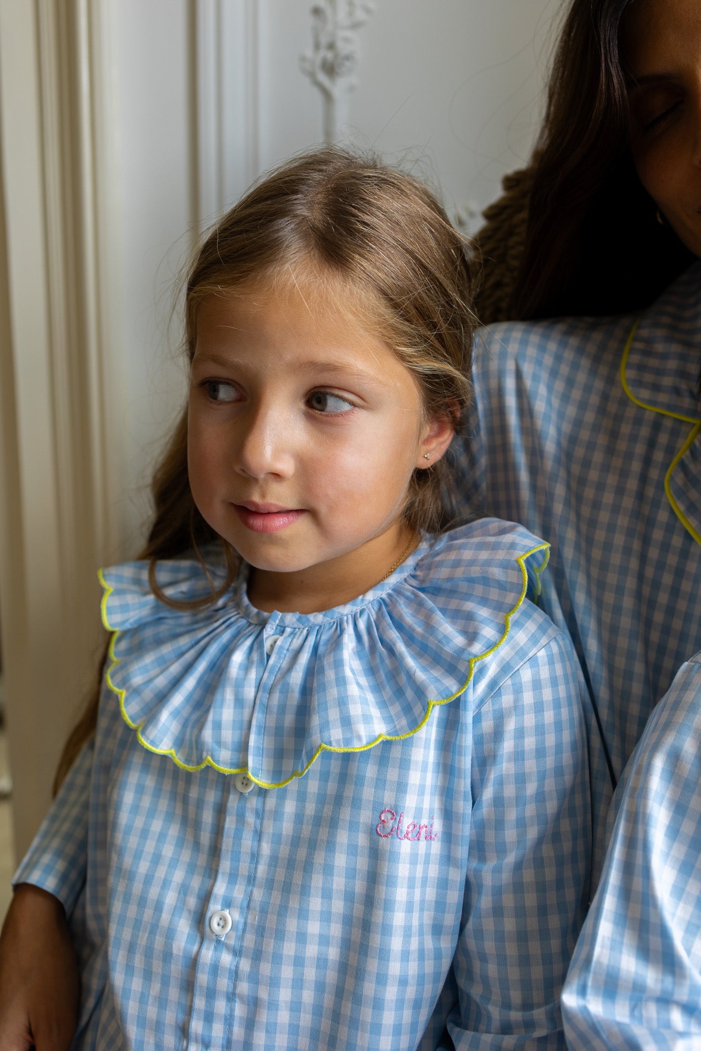 Pyjama très confortable et doux. Il présente un imprimé vichy Bleu Ciel avec des détails jaunes. Le haut est boutonné sur le devant.