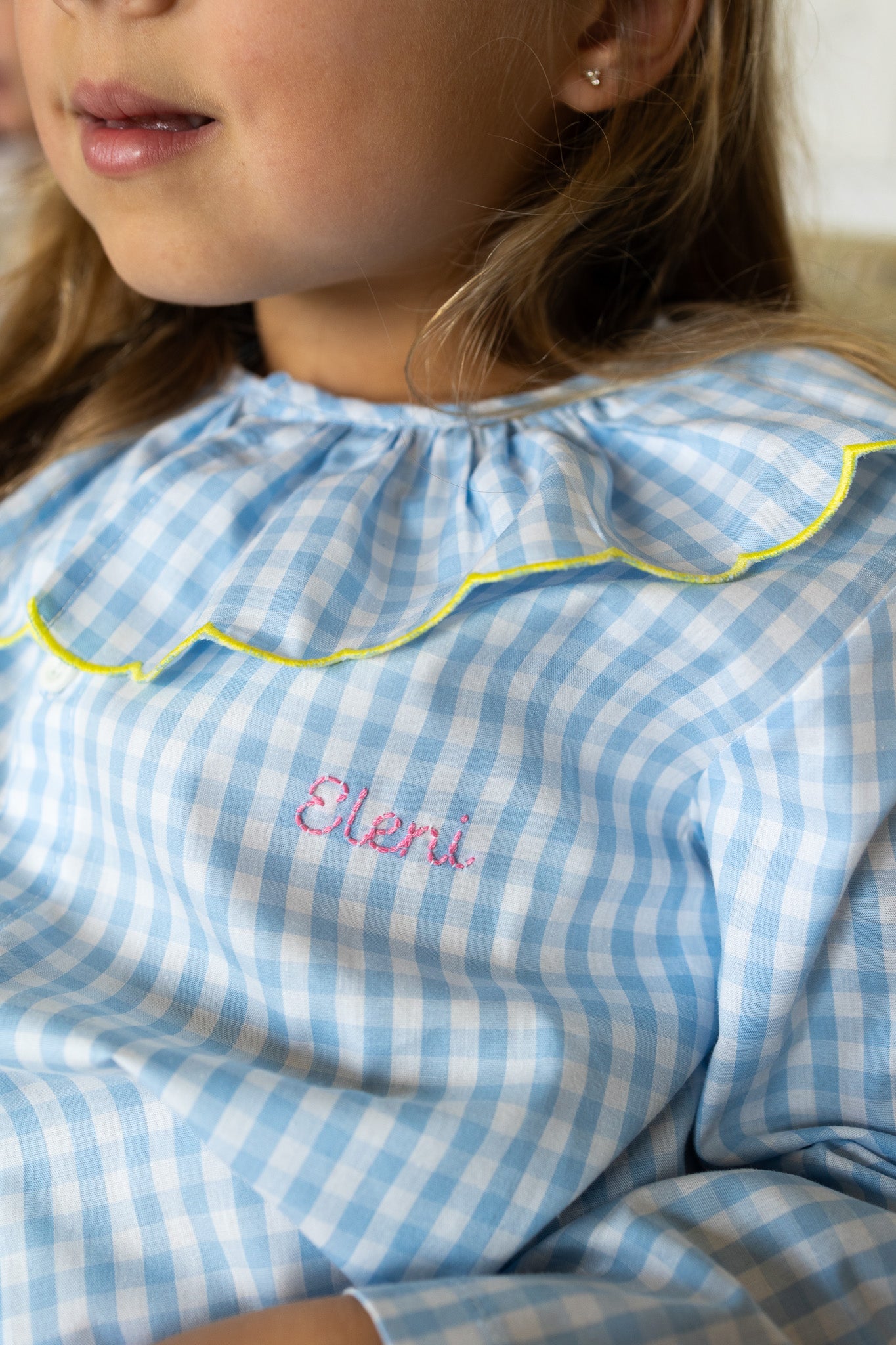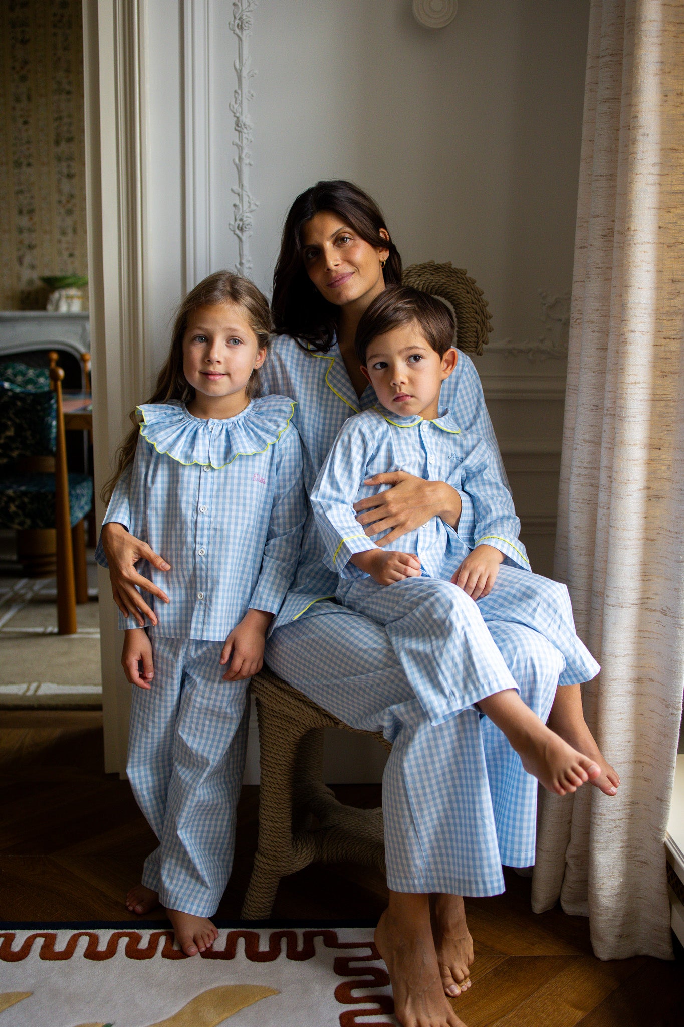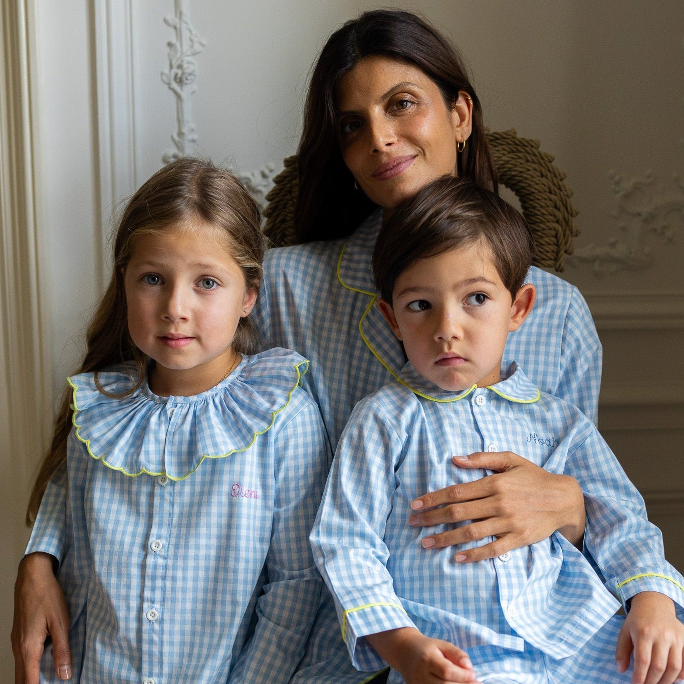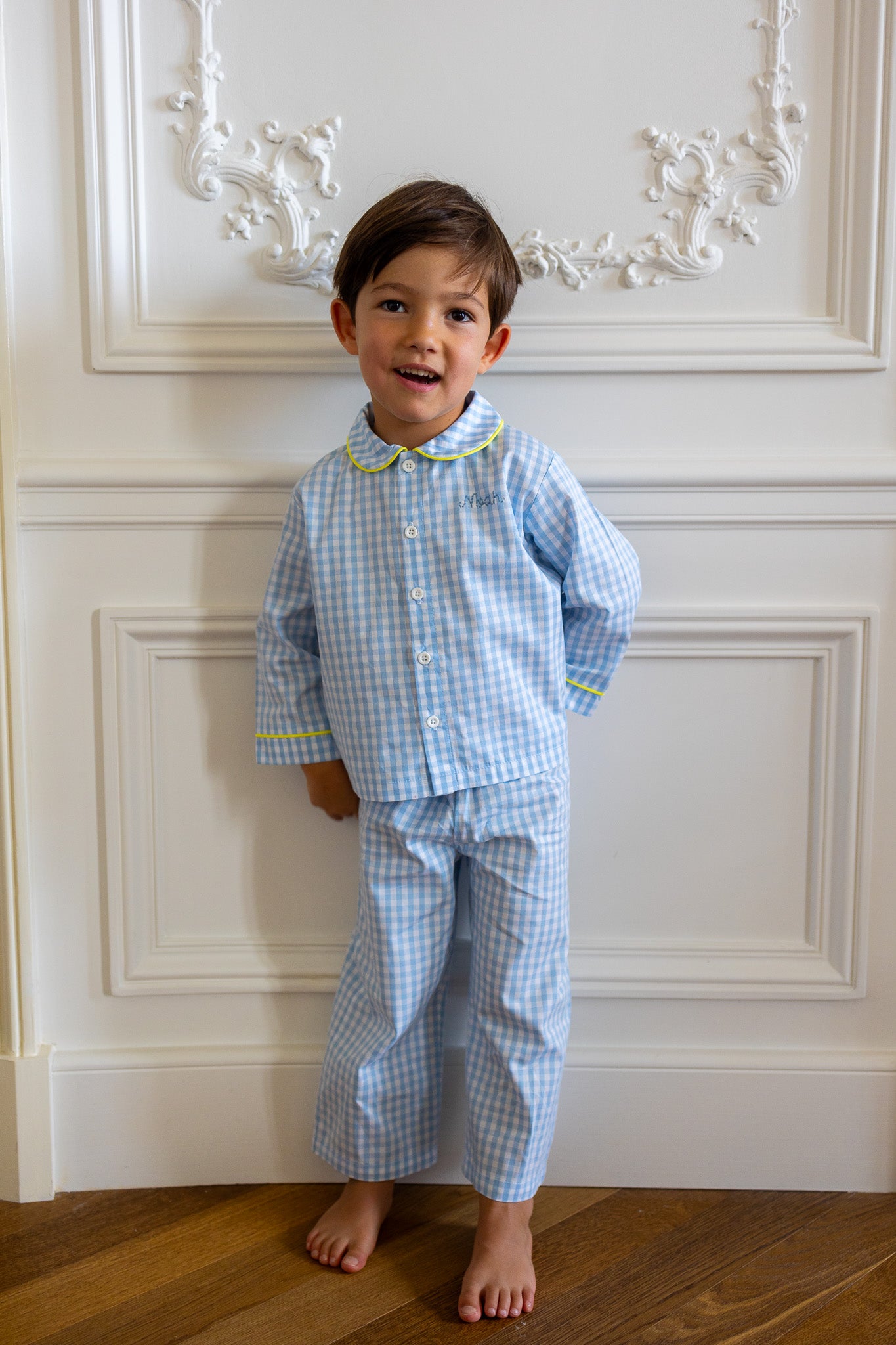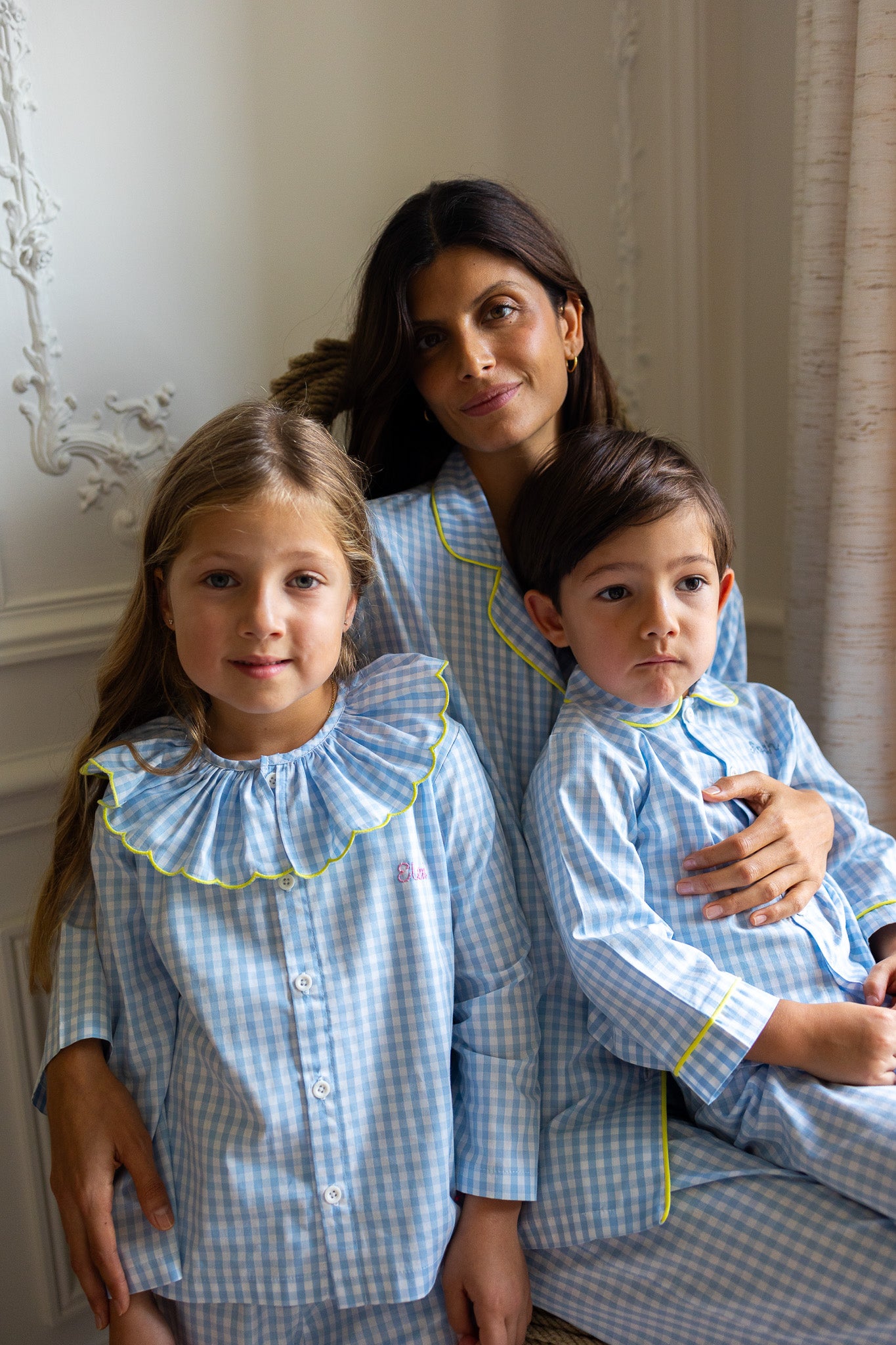 Pyjama très confortable et doux. Il présente un imprimé vichy Bleu Ciel avec des détails jaunes. Le haut est boutonné sur le devant.