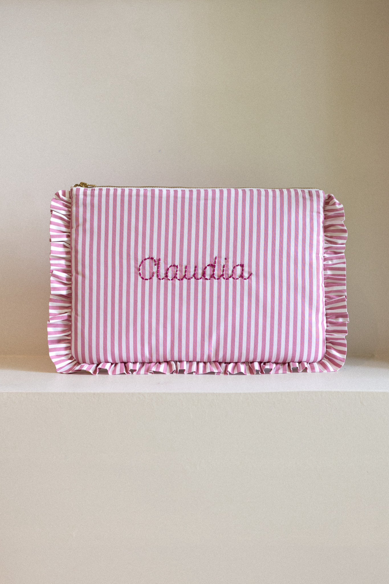 La broderie est réalisée à la main dans notre atelier au Portugal par nos brodeuses expérimentées et spécialisées. Vous pouvez personnaliser votre article avec un nom, un mot ou des initiales dans la couleur de votre choix. Pour référence, la couleur de broderie montrée dans les photos est 'Dark Pink'.