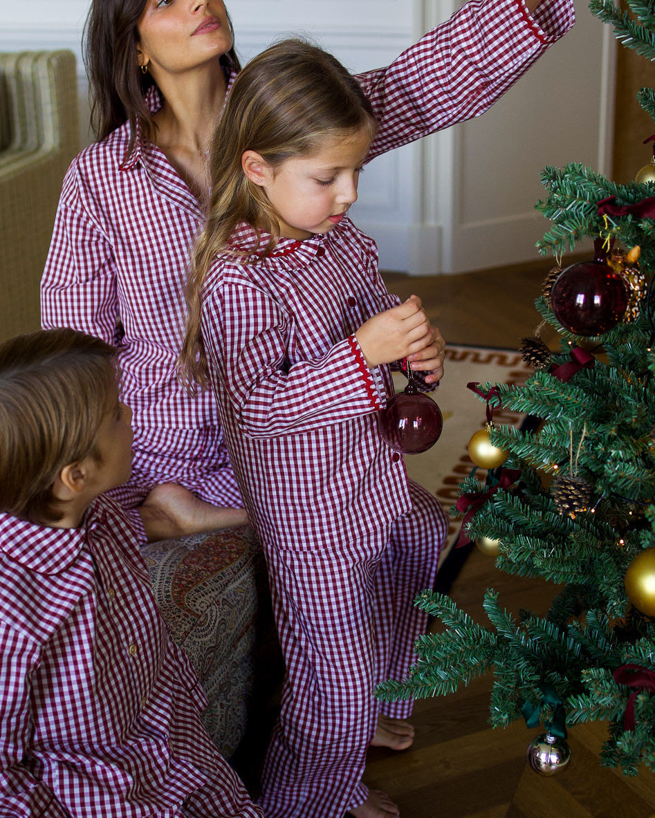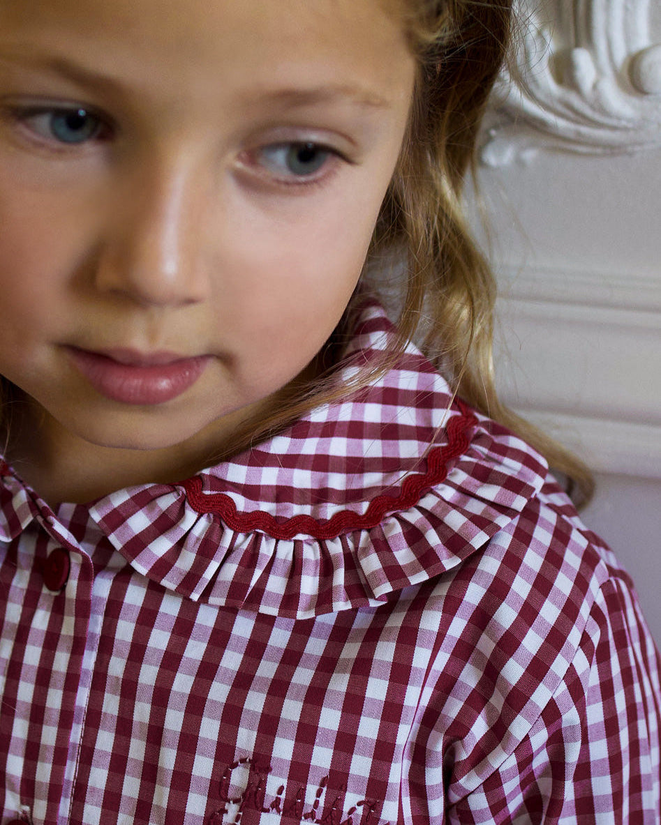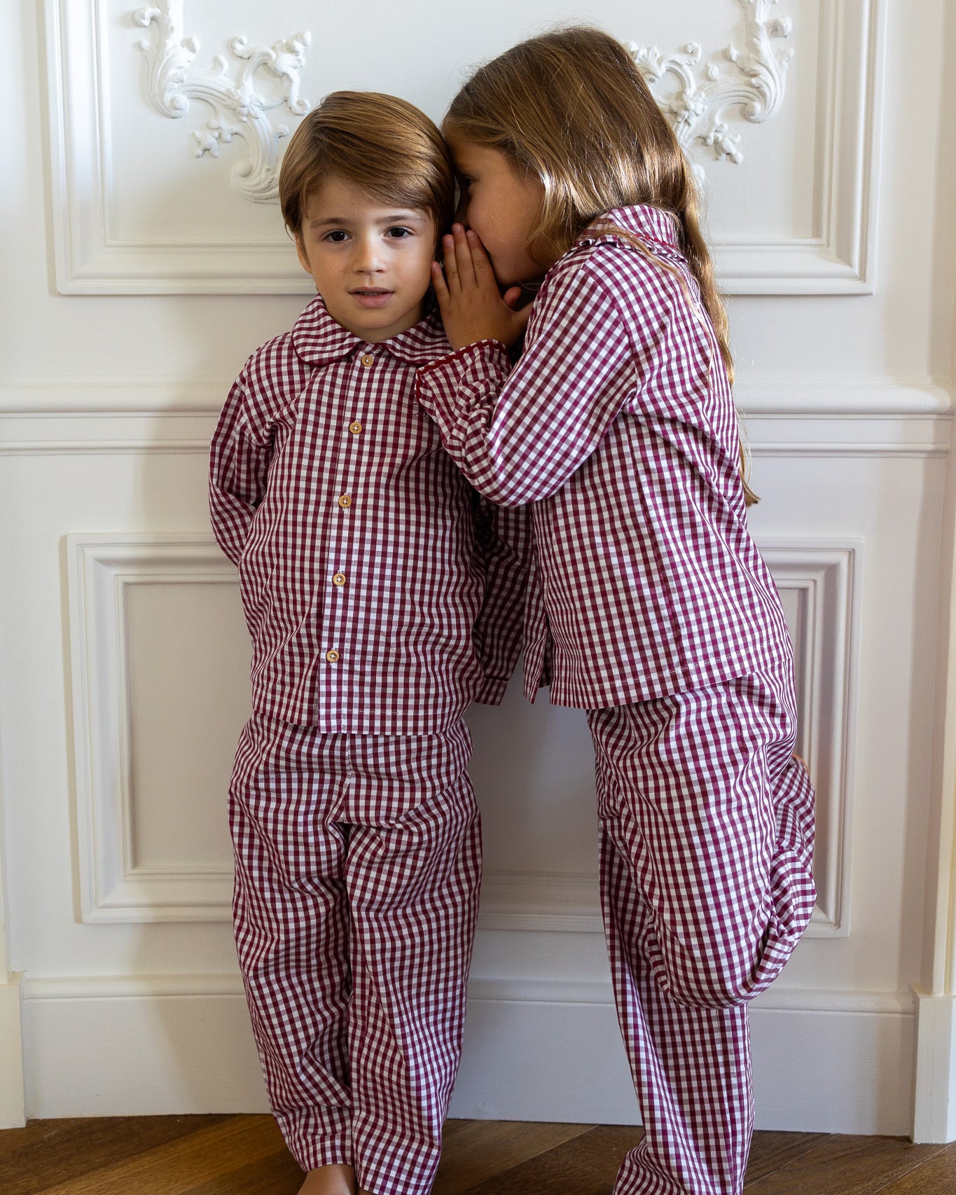Very comfortable and soft pyjama set. It features a burgundy gingham print with burgundy details on the collar and sleeves. The top is buttoned up in the front.